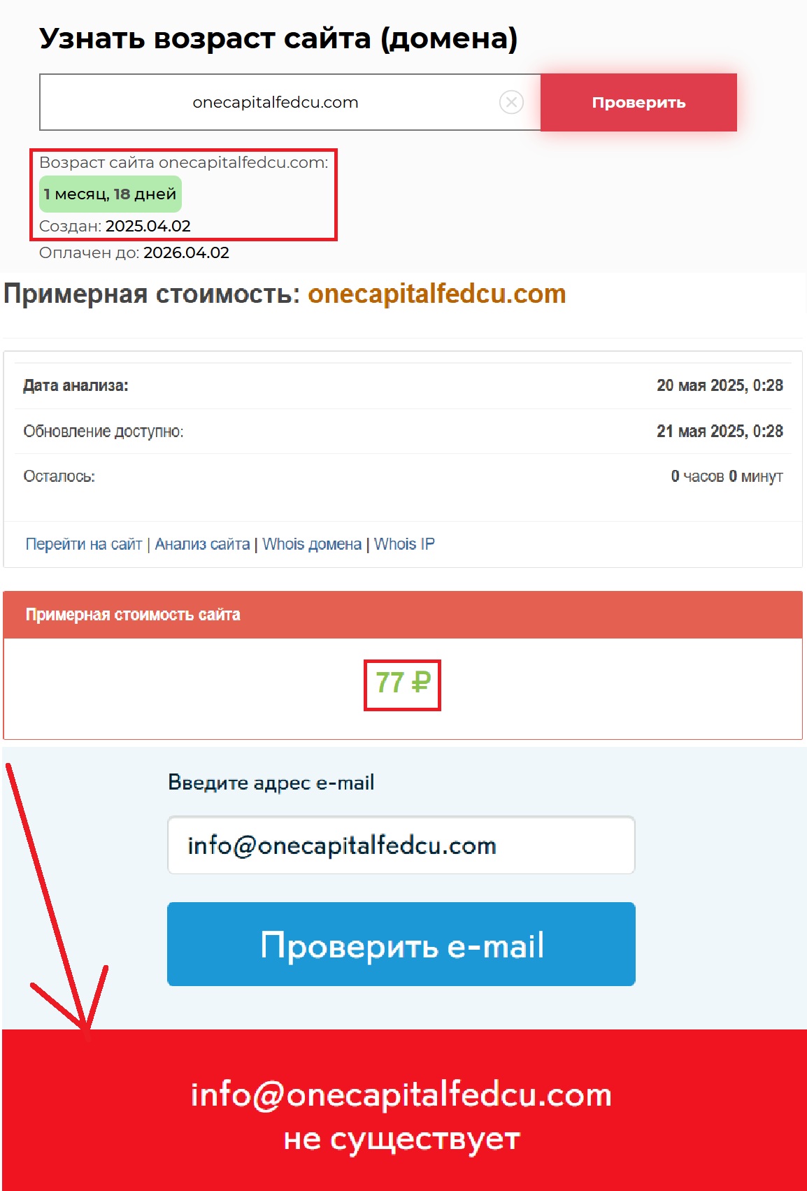 Но и это еще не все. В качестве контактов указаны: электронная почта info@onecapitalfedcu.com, телефон (706) 252-9726 и даже адрес офиса 153 E.53rd St.- 59th F, New York, NY 10022. Нам бы очень хотелось, чтобы это было правдой. Правда, хотелось бы. Но мы проверили каждый пункт. И результат, увы, предсказуем — все фейковое. Адреса не существует, телефон не обслуживается, а письма, судя по всему, просто уходят в никуда. Это не офис, это иллюзия заботы и открытости. Мошенники никогда не стремятся к реальному диалогу — им это попросту невыгодно.