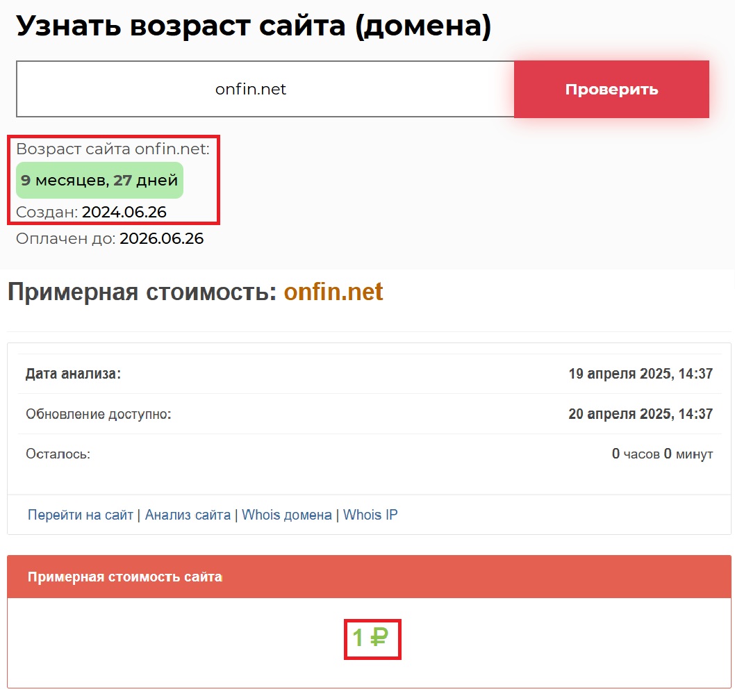 Мы провели дополнительную проверку. По данным сторонних аналитических сервисов, платформа OnFin начала свою активность совсем недавно. Всего 9 месяцев и 27 дней назад. То есть, по сути, перед нами новорожденный проект, который с первого дня начал вести себя как опытный игрок. Только вот опыт тут — чисто в плане манипуляций. Даже стоимость сайта вызывает недоумение. Один рубль — именно столько заплатили создатели за этот «шедевр». Вы серьезно думаете, что за такую сумму можно запустить легальный и профессиональный проект? Сомневаемся. Очень сильно.