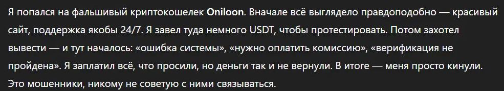 Не стоит забывать, что любой надежный криптовалютный кошелек обязан быть максимально прозрачным. Он должен открыто демонстрировать юридическую регистрацию, понятную структуру управления, официальные контакты, лицензии. Также действительно безопасный для работы проект обязан иметь положительную репутацию. В случае с Oniloon все совершенно наоборот.