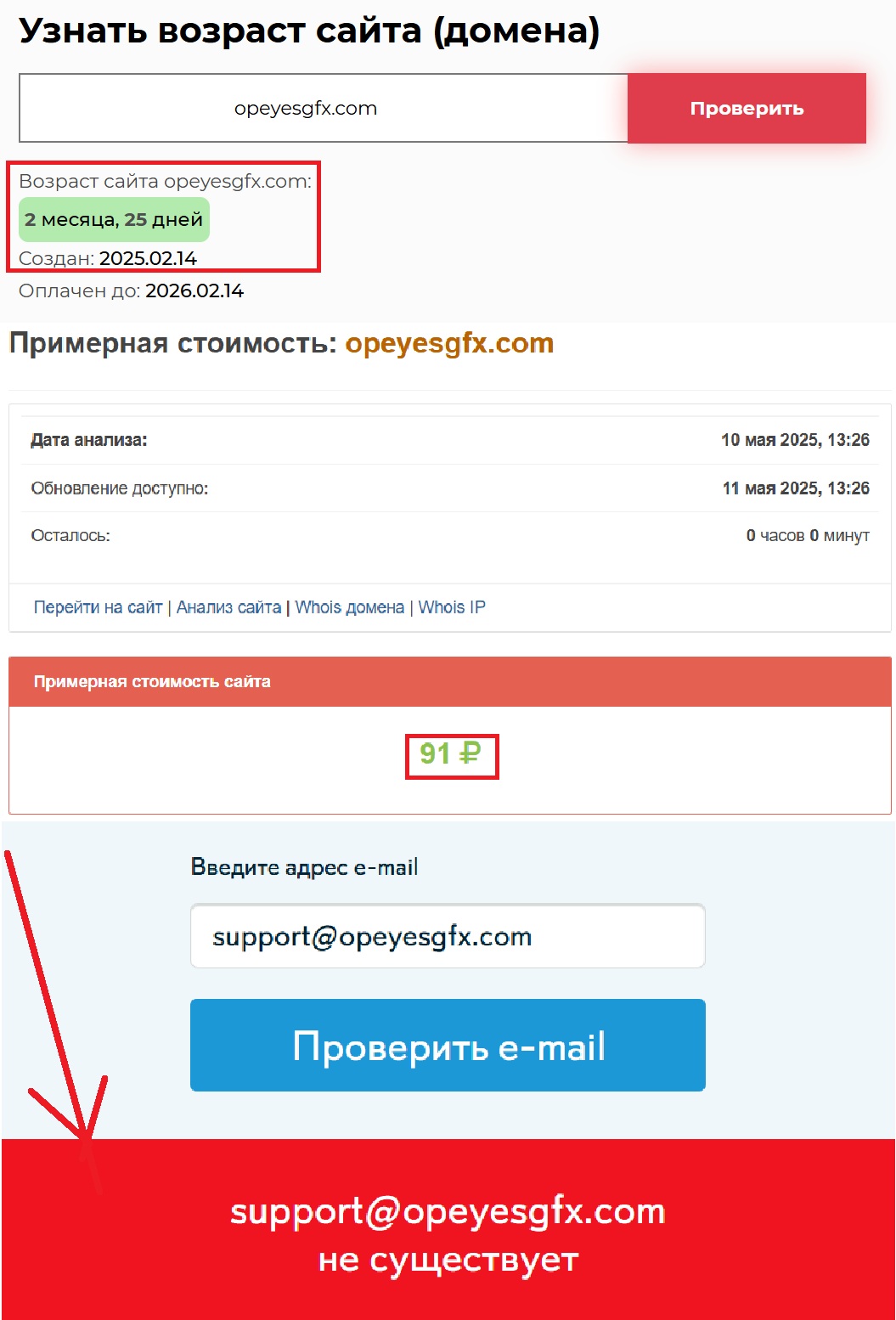 И еще кое-что. Платформа существует всего-то 2 месяца и 25 дней! А стоимость самого сайта — буквально 91 рубль. Не нужно быть экспертом в инвестициях, чтобы понять: серьезная компания не экономит на таких базовых вещах. К тому же, никакой контактной информации. Ни телефона, ни адреса, ни живого чата. Захотите задать вопрос — а некуда. Даже электронная почта support@opeyesgfx.com фейковая. Просто не с кем поговорить. Все направлено только на то, чтобы вы перевели деньги. А дальше — как получится.