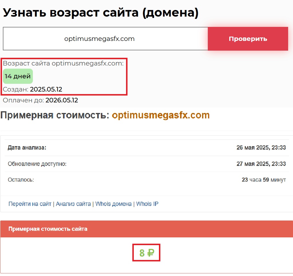 Мы проверили ресурс с помощью сторонних аналитических сервисов — и вот что выяснили. Домен был зарегистрирован всего 14 дней назад, то есть 12 мая 2025 года. На деле Optimus Mega Fx — новенький, сырой и абсолютно нелегальный «брокер», которому всего пара дней от роду. А теперь внимание: стоимость этой площадки составляет восемь рублей. Вы не ослышались — ровно ноль. Хотите верить, что за такую цену можно получить надежный и качественный сервис? Мы — нет. И никто из тех, кто сталкивался с этим проектом, уже не верит. Потому что все эти «инвестиции», все эти разговоры об «экспертной поддержке» — это всего лишь иллюзия, чтобы усыпить бдительность.