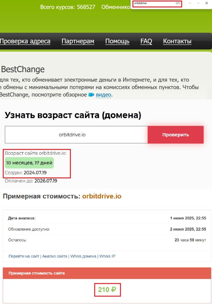 При проверке домена Orbitdrive выясняется, что он был зарегистрирован примерно 10 месяцев назад (и, соответственно, работает платформа не несколько лет, как о том рассказывают аферисты).