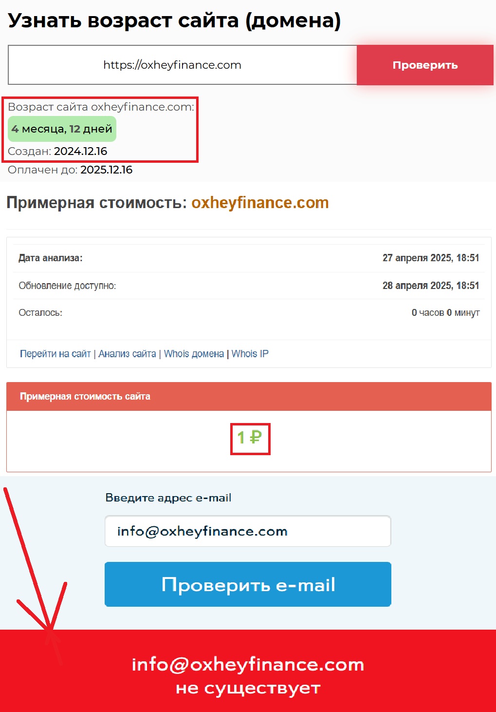 Но давайте зададим себе важный вопрос: что мы вообще знаем о Oxhey Finance? Ответ, к сожалению, очевиден — практически ничего. Проверка через сервисы Whois и Seolik дает понять: сайт работает всего 4 месяца и 12 дней, с 16 декабря 2024 года. Какой нормальный брокер успевает за такой срок создать себе репутацию? Ответ один — никакой. Аферисты знают, что времени у них мало, и потому действуют быстро и нагло.