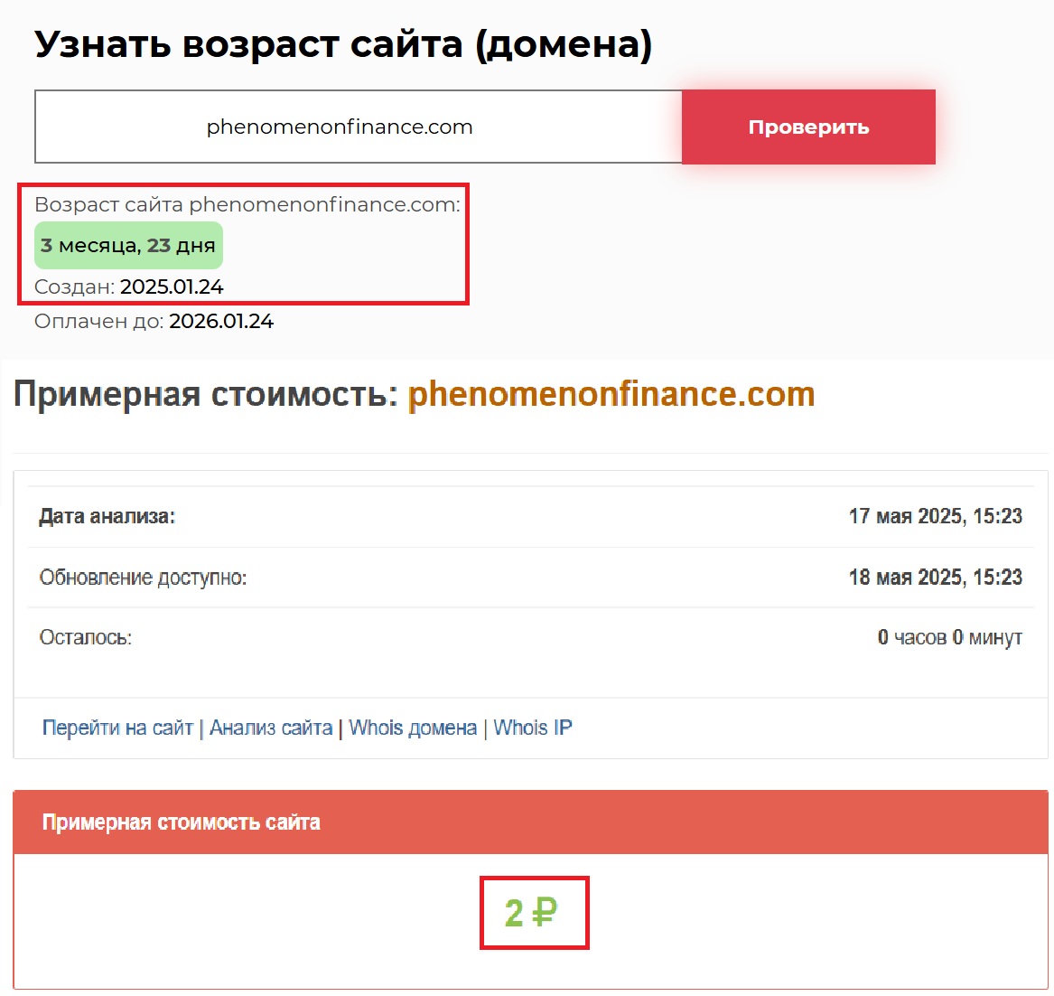 Срок жизни сайта — меньше года. Точнее, около четырех месяцев. И даже эта дата — под вопросом, потому что кто знает, может, домен купили с рук, а до этого он принадлежал совершенно другому проекту. Факт в том, что настоящей истории у PHENOMENON FINANCE GROUP нет. Одни слова. Одни обещания. И ни одной реальной цифры, подтвержденной документами. Зато цена — два рубля.