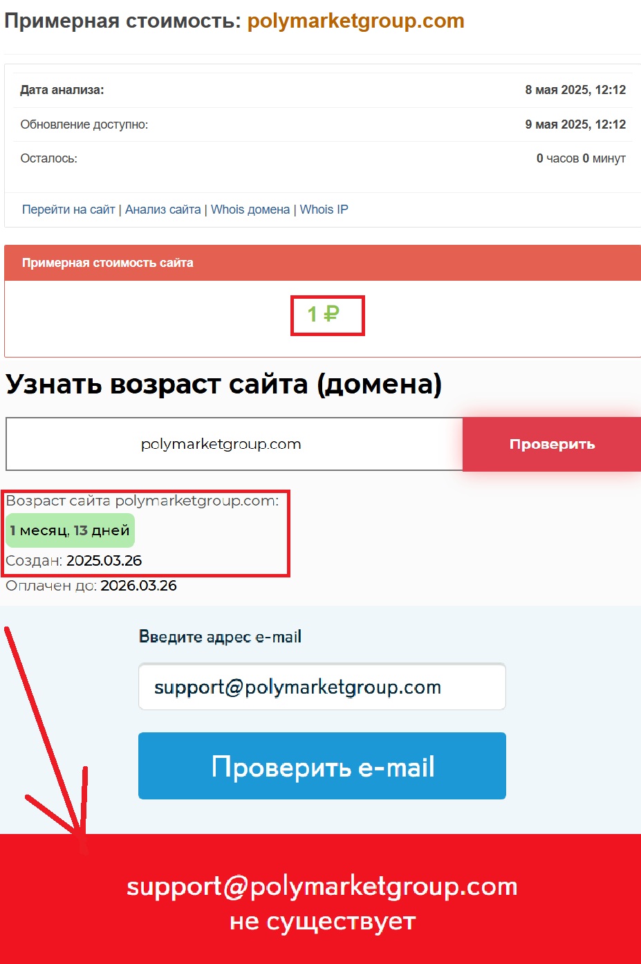 Вы задумывались, зачем аферистам каждый раз делать новый сайт, если старый только начал «пахнуть» жареным? А все просто — как только начинают появляться жалобы и негативные отзывы, они бросают старый проект и запускают все заново. По тому же шаблону, с теми же трюками. Только логотип новый и название свежее. И вот polymarketgroup.com — это один из таких свежевыпущенных «стартапов».