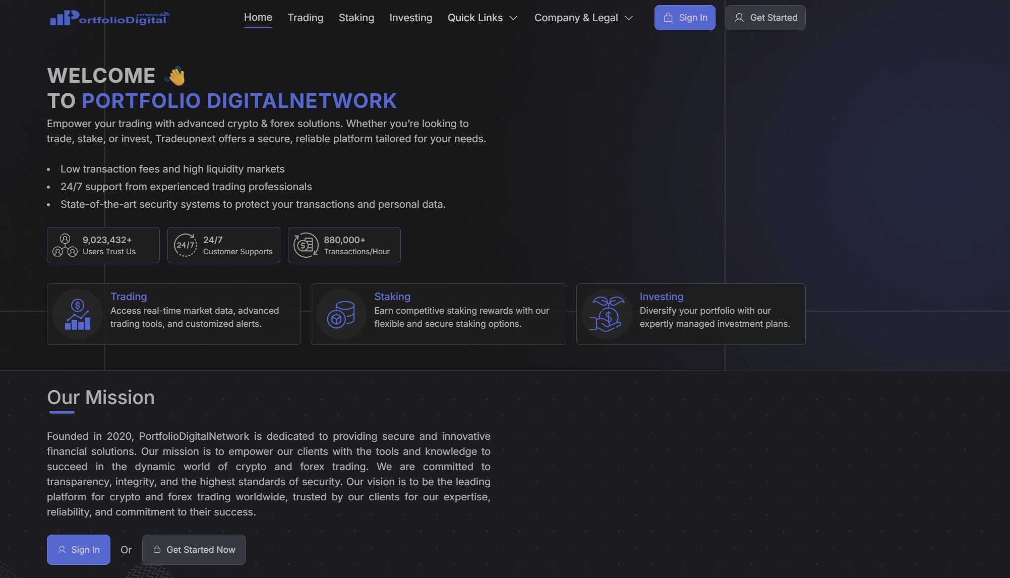 Первое, на что хочется обратить ваше внимание — сайт portfoliodigitalnetworks.com. Согласитесь, когда речь идет о финансовых услугах, особенно о брокерской деятельности, ожидаешь увидеть серьезный, проработанный до мелочей ресурс. С четкой навигацией, внятным интерфейсом, актуальной информацией. А что мы имеем по факту? Перед нами примитивно собранная страница, построенная по стандартному шаблону, который, как нам кажется, уже изрядно «засветился» в десятках других сомнительных проектов. Только название меняется, а так — все по кругу.