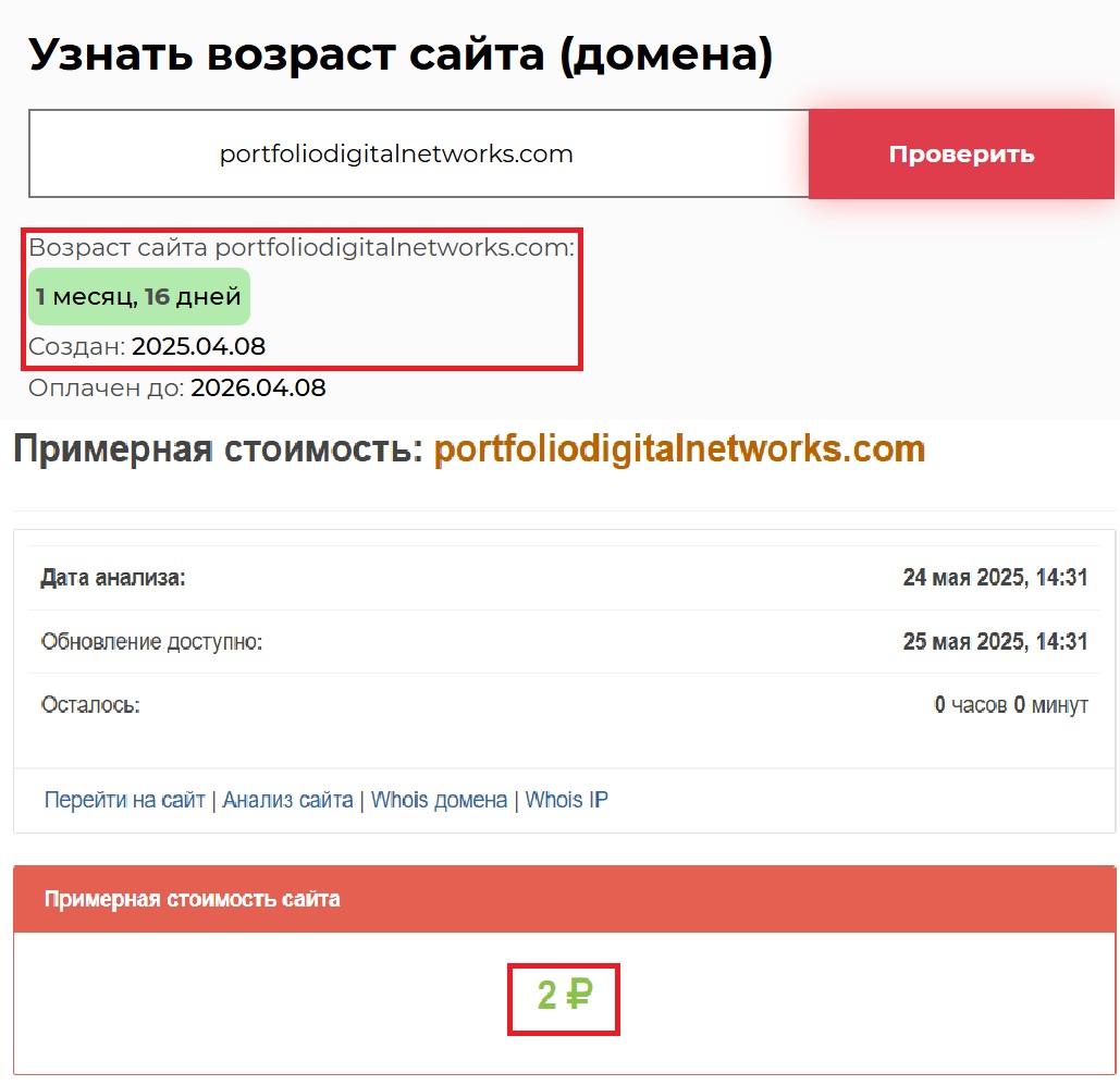 Но все это — еще не финальный аккорд. Нас особенно заинтересовал возраст ресурса. Portfolio DigitalNetwork утверждает, что работает на рынке не первый год, имеет, мол, репутацию и доверие. Однако проверка показала: сайт появился совсем недавно. Если быть точными, активность на сайте началась только в начале апреля 2025 года. И даже тогда — скорее техническая, чем содержательная. То есть перед нами свеженький проект, который зачем-то маскируется под старый. Зачем? Ну, вы сами понимаете. Да и стоимость в два рубля аналогично не вызывает доверия.