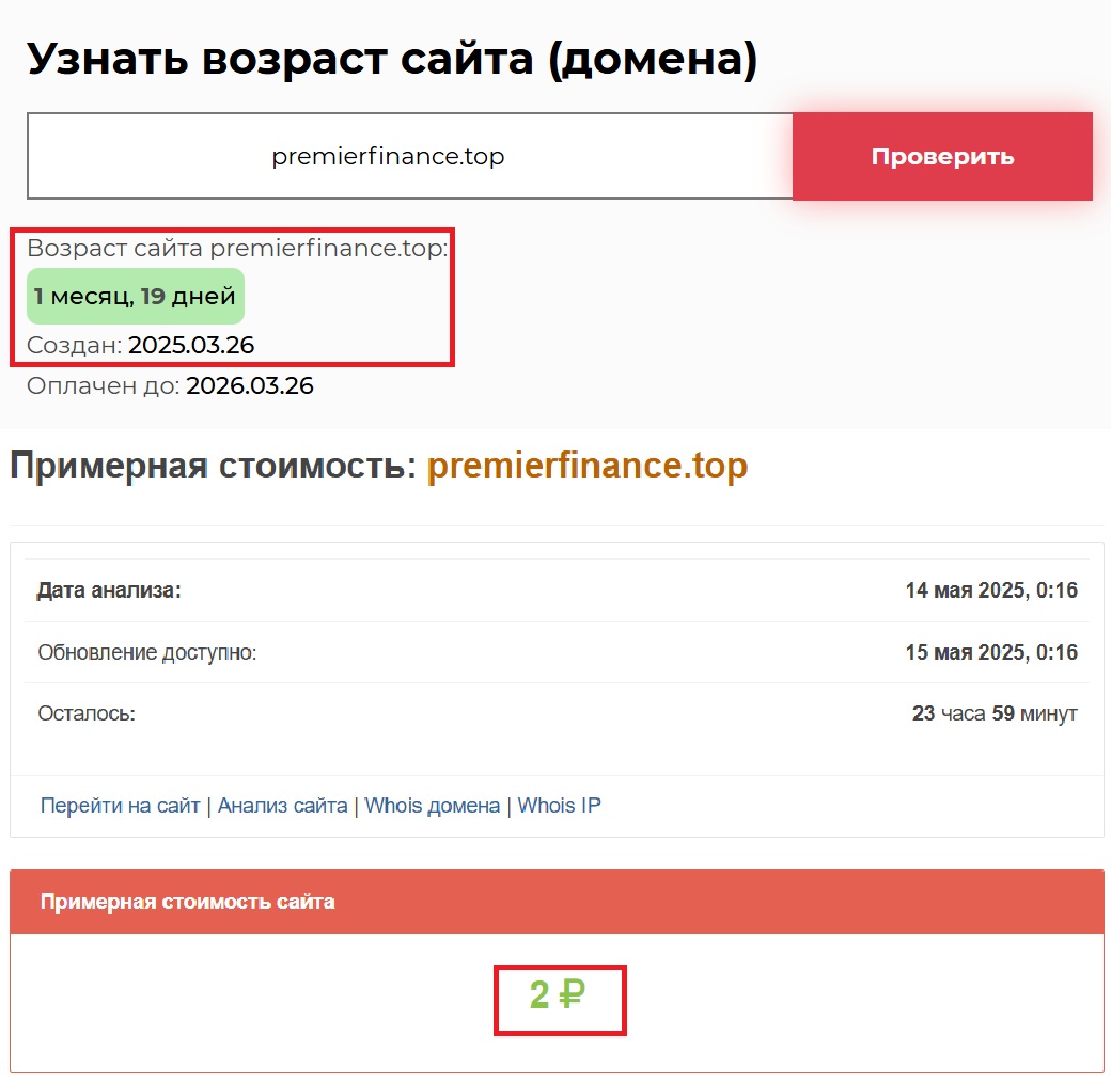 А теперь немного фактов. Согласно технической проверке, настоящая активность PREMIER FINANCE начинается лишь с 26 марта 2025 года, и то — очень вяло. Сказать, что они давно на рынке — значит просто поддаться на обман. Кстати, стоимость сайта, по оценке независимых сервисов — два рубля. Даже комментировать тут особо нечего. Это просто смешно, если бы не было так грустно.