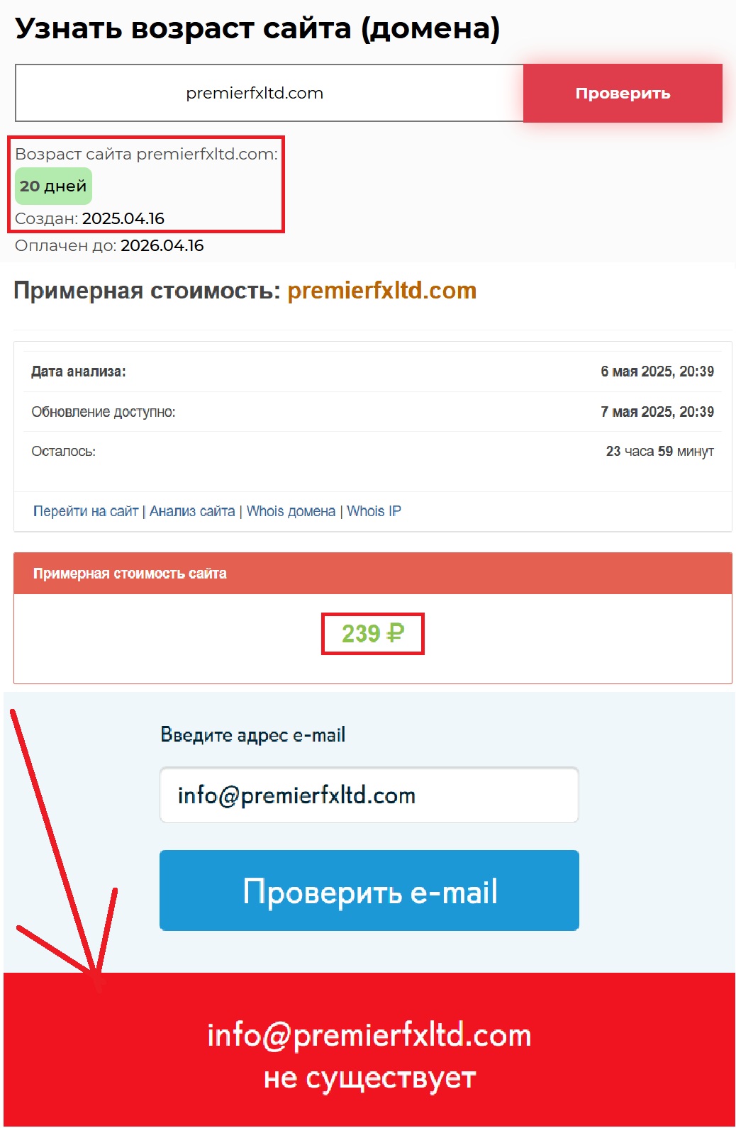 Стоимость домена? 239 рублей. Смешно? Нам — не очень. Потому что это цена за доверие людей, которые потом остаются без средств. И, кстати, если вас все еще не смутили ни поддельные даты, ни пустой сайт, ни фейковые отзывы, обратите внимание на контактные данные. Электронная почта info@premierfxltd.com фейковая, адрес в Великобритании — фиктивный, а номер телефона… ну, его можно купить хоть завтра в интернете. Мы не устаем повторять: доверие — это не то, что можно отдать с первого взгляда. И уж точно не стоит передавать его в руки тем, кто не может подтвердить ни одного своего слова.