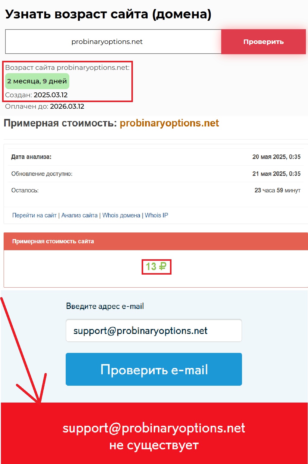 Контакты? Отсутствуют. Ни телефона, ни адреса, ни внятной формы обратной связи. Даже элементарная электронная почта support@probinaryoptions.net оказалась фейком. И что самое интересное — им это даже не нужно. Потому что их цель — не работа с клиентом. Их цель — взять деньги и раствориться. Да что тут говорить, если стоимость площадки составляет ровно 13 рублей.