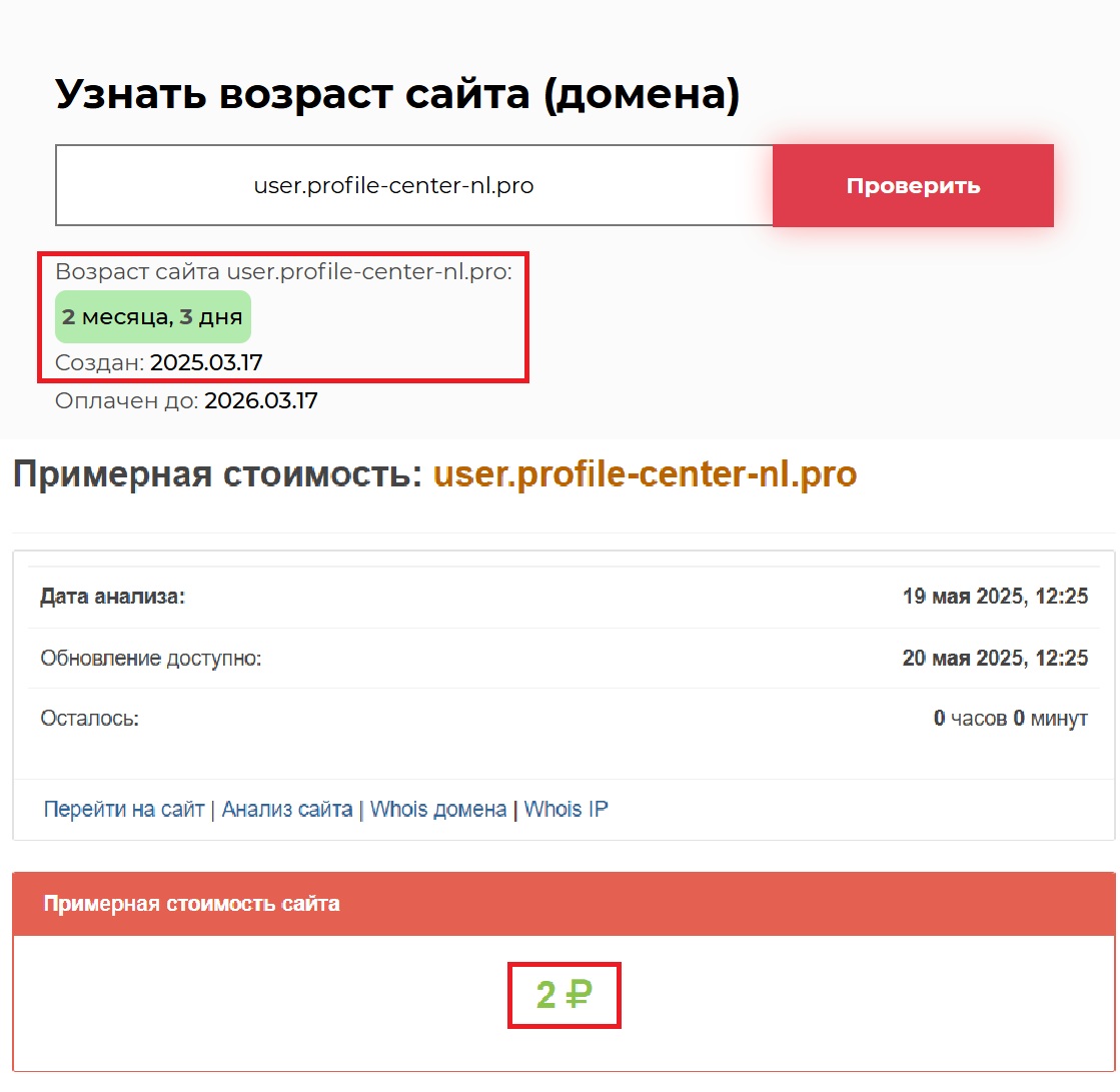 Если вдруг кто-то еще сомневается, достаточно взглянуть на дату регистрации сайта. Profile Center появился 17 марта 2025 года, то есть чуть больше двух месяцев назад. Какой там «опыт», какие «успехи на рынке»? Это миф, обертка, которая должна прикрыть откровенно мошенническую схему. Кстати, по данным сервиса Seolik сайт стоит всего лишь два рубля. Видимо, аферисты чувствуют, что скоро все закончится — и решили выжать из этого все до последнего рубля.