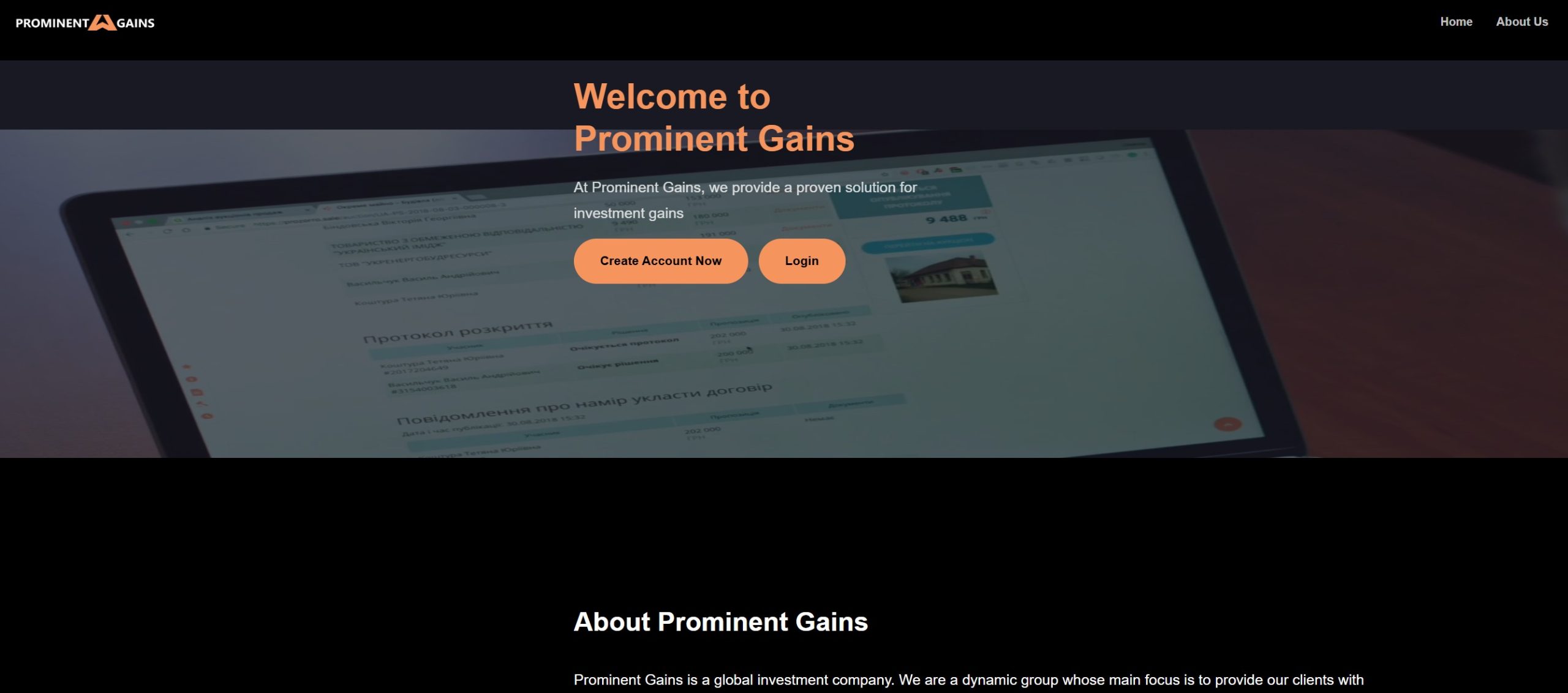 Но давайте разберемся подробнее. Все начинается, как обычно, с сайта. Вы переходите по адресу prominentgains.com — и сразу становится понятно: перед вами очередная дешевая подделка. Сайт построен на шаблоне, который мы уже видели десятки раз. Те же блоки, те же кнопки, только цвета другие. Ну и название, конечно. Остальное? Осталось без изменений. Настолько все примитивно, что даже обидно — и за веб-дизайн, и за ваш потраченный трафик.