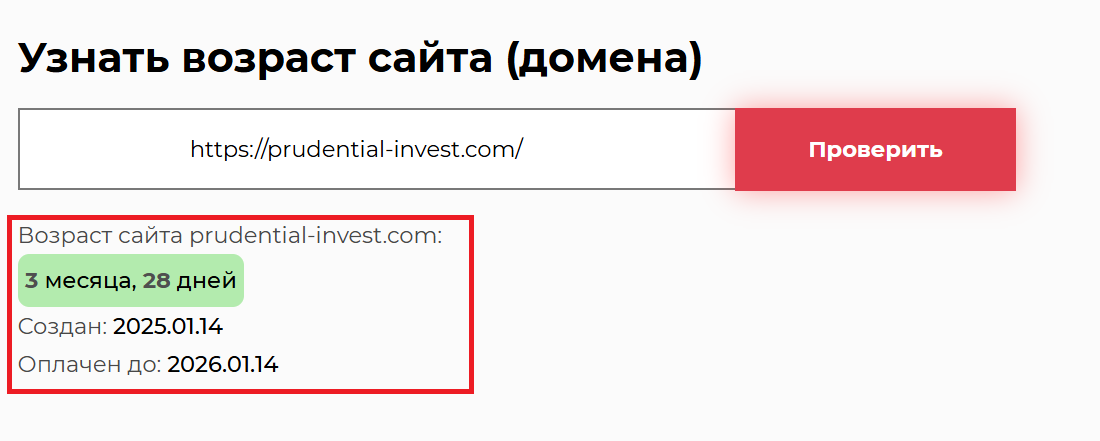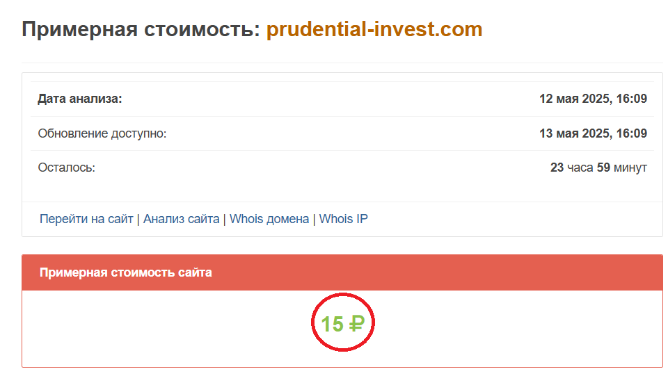 При проверке сайта Prudential Investment выясняется, что он был зарегистрирован всего несколько месяцев назад. Его примерная стоимость равняется к 15 рублям, что считается ничтожно малым показателем, как для «серьезной» организации.
