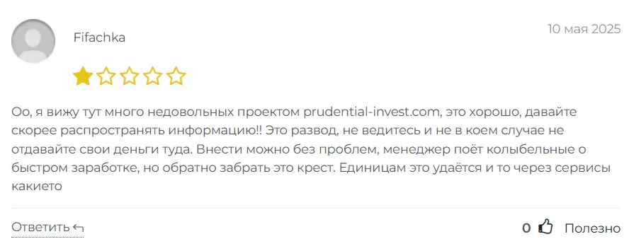 Отзывы бывших клиентов о Prudential Investment указывают на то, что это обыкновенная ловушка. Люди жалуются на невозможность вывода средств, отсутствие поддержки и прозрачности. По словам пользователей, они без проблем вносили финансы, но ничего не могли получить в ответ. Их аккаунты часто блокировали, а на сайте, при совершении запросов на вывод, начинали возникать разнообразные технические проблемы. Служба поддержки при этом, как отмечают юзеры, никак не реагировала на сообщения либо отвечала слишком медленно.