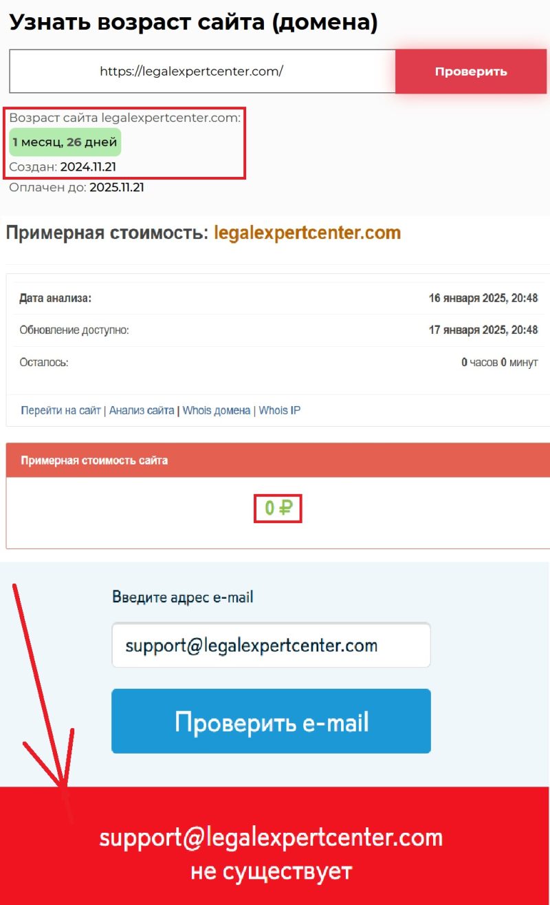Проверка при помощи специальных сервисов показала, что герой данного обзора использовал сайт, который появился 1 месяц и 26 дней назад, то есть 21 ноября 2024 года. Согласитесь, когда речь идет о юристе с многолетним опытом, то вы явно представляете результат получше.