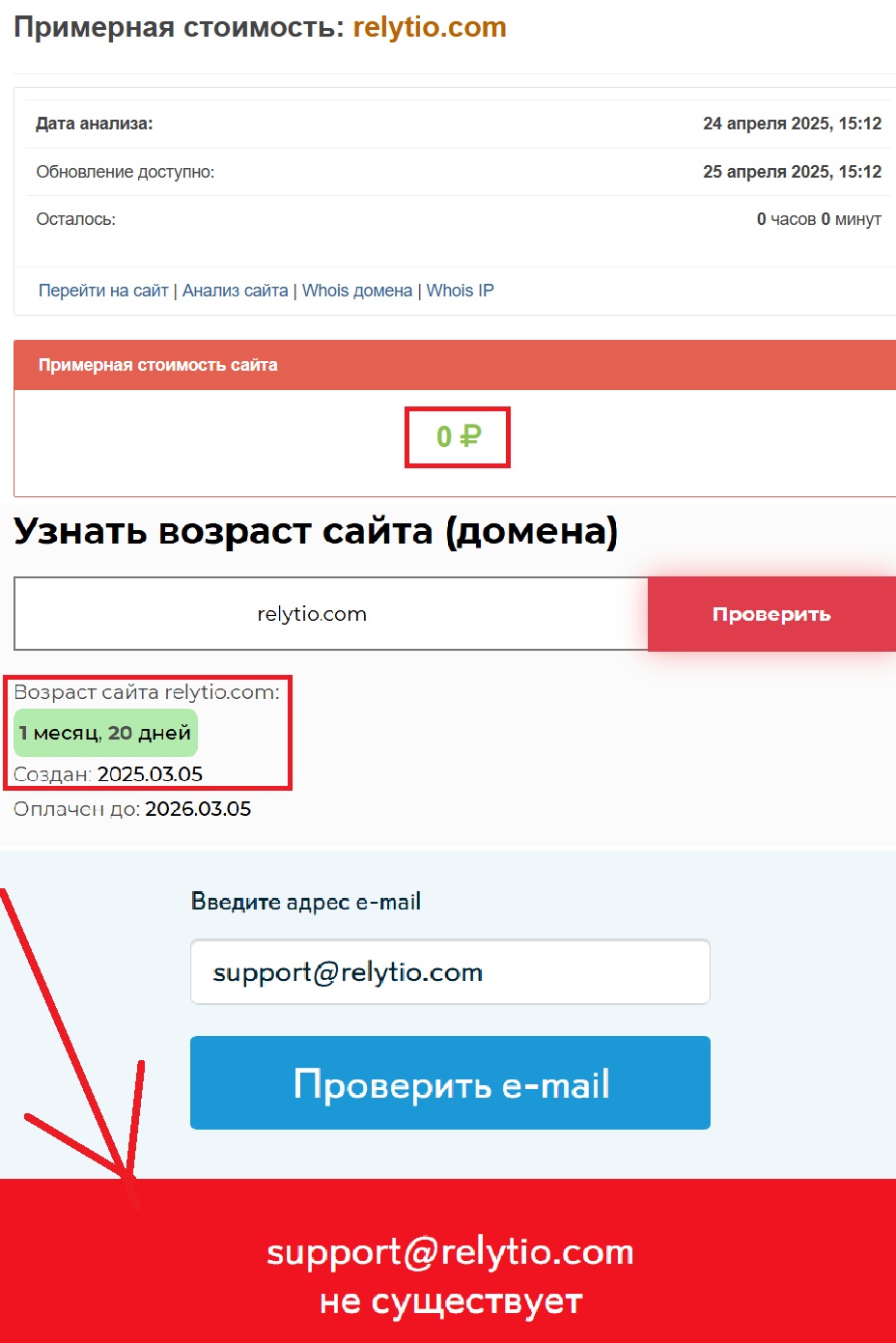 Мы провели проверку с помощью нескольких сторонних сервисов. И знаете, что обнаружили? Аферисты просто создали домен 5 марта 2025 года. То есть опыт тут — мнимый. Как и все остальное. Ну а стоимость сайта — целых ноль рублей. Да-да, ноль. Даже смешно. Добавьте сюда еще и тот факт, что герой данного обзора указывает фейковую почту support@relytio.com, поддельный адрес 15 Boulevard du Larvotto, 98000 Monaco и т.д. Что мы хотим донести до вас? Будьте внимательны. Не спешите доверять деньги тем, кто обещает многое, но не дает вообще ничего конкретного. Relytio — отличный пример лжеброкера.
