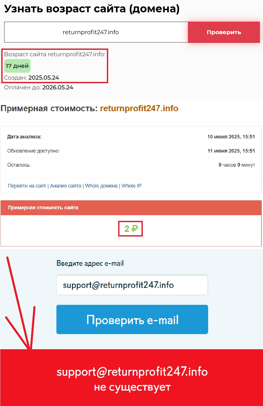 А если вдруг вы захотите разобраться, связаться с техподдержкой или просто задать вопрос — удачи. Контактных данных практически нет, а те, что указаны, скорее всего фиктивные. Адреса не подтверждаются, звонки не принимаются, почта support@returnprofit247.info не существует. Все это уже не просто тревожные звоночки.