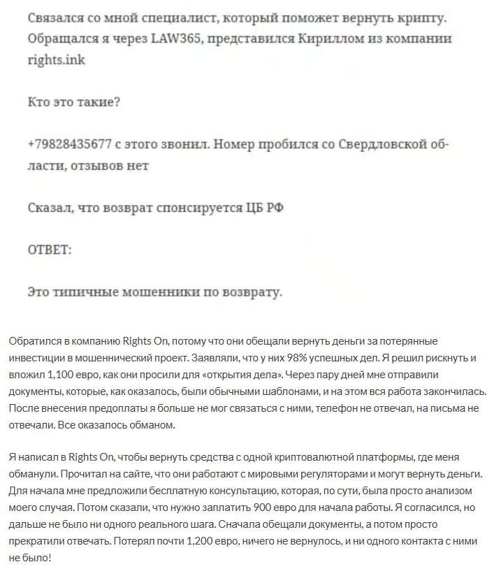 Основатели Rights On заявляют, что работают в консалтинговой сфере более 10 лет. Также они рассказывают о сотрудничестве с мировыми финансовыми регуляторами, предлагая свои услуги якобы на высоком уровне. Шарлатаны обещают положительные результаты при обращении к ним с запросом на возврат украденных злоумышленниками средств, финансовое планирование, налоговую консультацию и помощь в страховании.