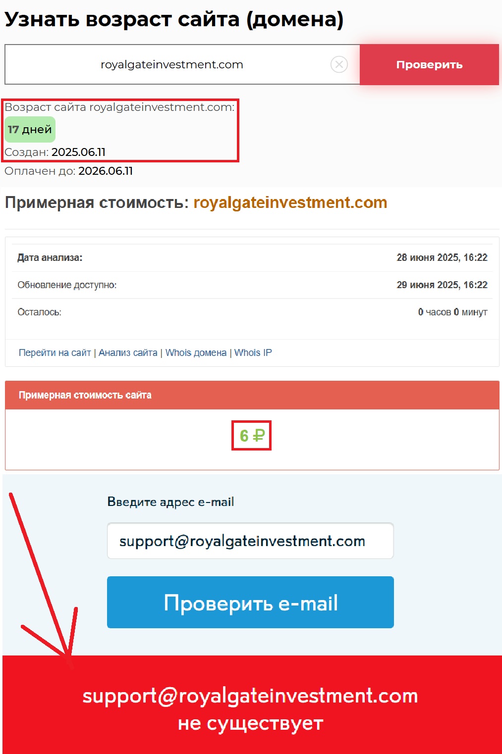 Информации о компании — минимум. Кто стоит за проектом? Где зарегистрирована фирма? Есть ли лицензия? На эти вопросы вы не получите ответа. Вместо этого — стандартный набор: фальшивая электронная почта support@royalgateinvestment.com, некий телефон +1 (628) 237-8442 и сомнительный адрес, который при проверке, к слову, не существует. Даже если вам удастся написать — ответа вы не дождетесь. Все работает в одну сторону: вы — деньги, они — молчание.