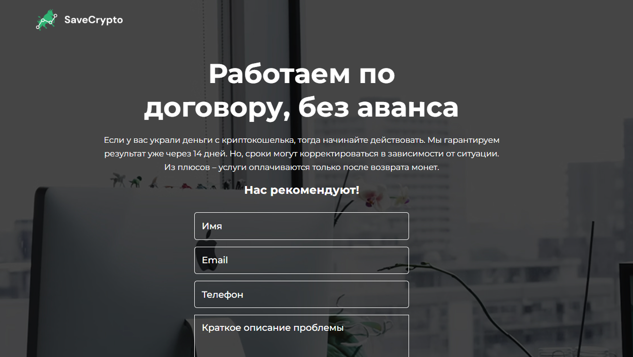 Таким же может быть итог работы с SaveCrypto. Контора является очередной организацией-фальшивкой от которой не стоит ожидать помощи. Заявлениям шарлатанов о многолетнем опыте работы противоречат реальные факты: домен проекта был создан около 3 месяцев назад, что прямо указывает на его молодость.