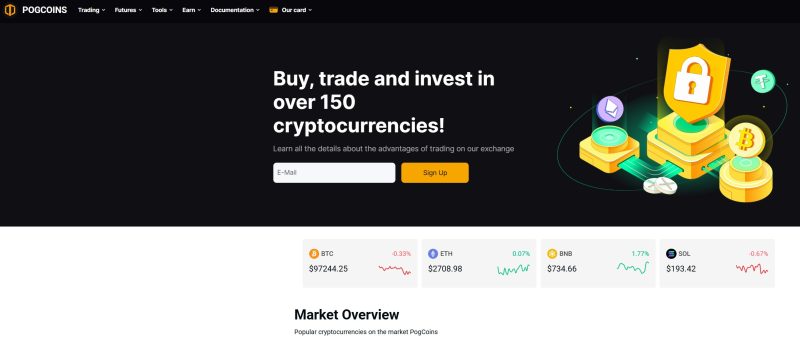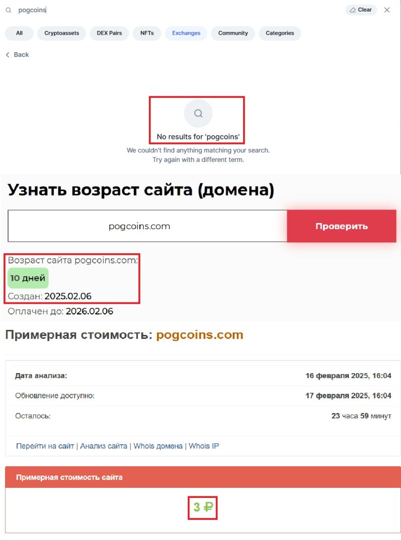 Сайт pogcoins.com, который должен служить основой деятельности, оказался шаблонной конторой с примитивным дизайном. Никаких уникальных элементов, полное отсутствие оригинальности — похоже, аферисты просто скопировали код и запустили свою фальшивую биржу. При этом никакой документации на сайте нет, лицензии отсутствуют, а возраст проекта — всего десять дней. Совсем неудивительно, ведь подобные платформы появляются и исчезают с невероятной скоростью.