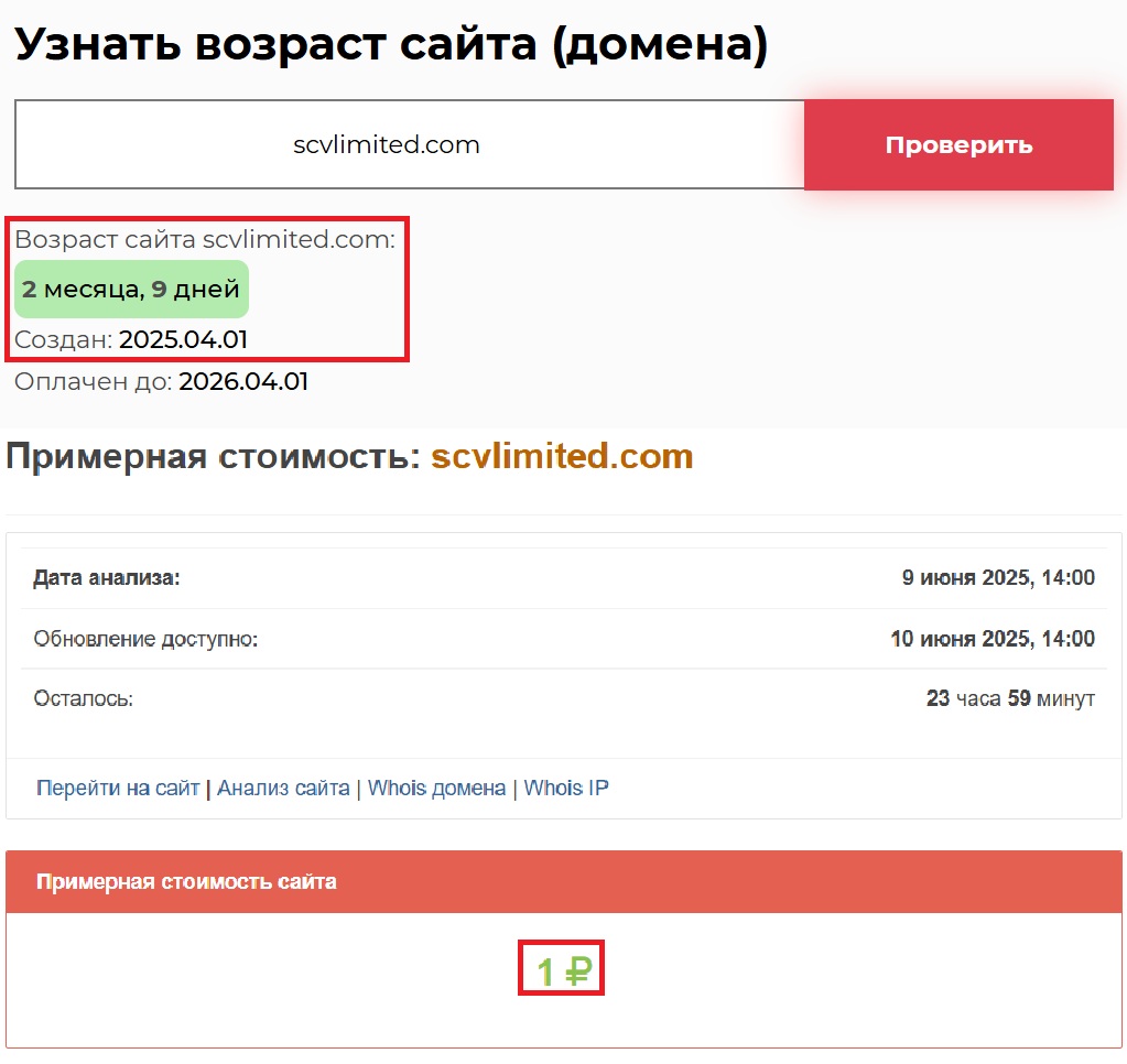 Зайдя на scvlimited.com, сразу бросается в глаза минимализм и отсутствие какой-либо серьезной информации. Нет ни документов, ни подтверждений легальности, и даже контактные данные вызывают сомнения — номер телефона и адрес электронной почты выглядят фейковыми, а попытки связаться с поддержкой остаются без ответа. Неудивительно, ведь проект зарегистрирован совсем недавно, буквально 2 месяца и 9 дней назад, и его стоимость — смешной один рубль. Один рубль! Даже кофе в кафе стоит дороже. О какой реальной работе здесь может идти речь?