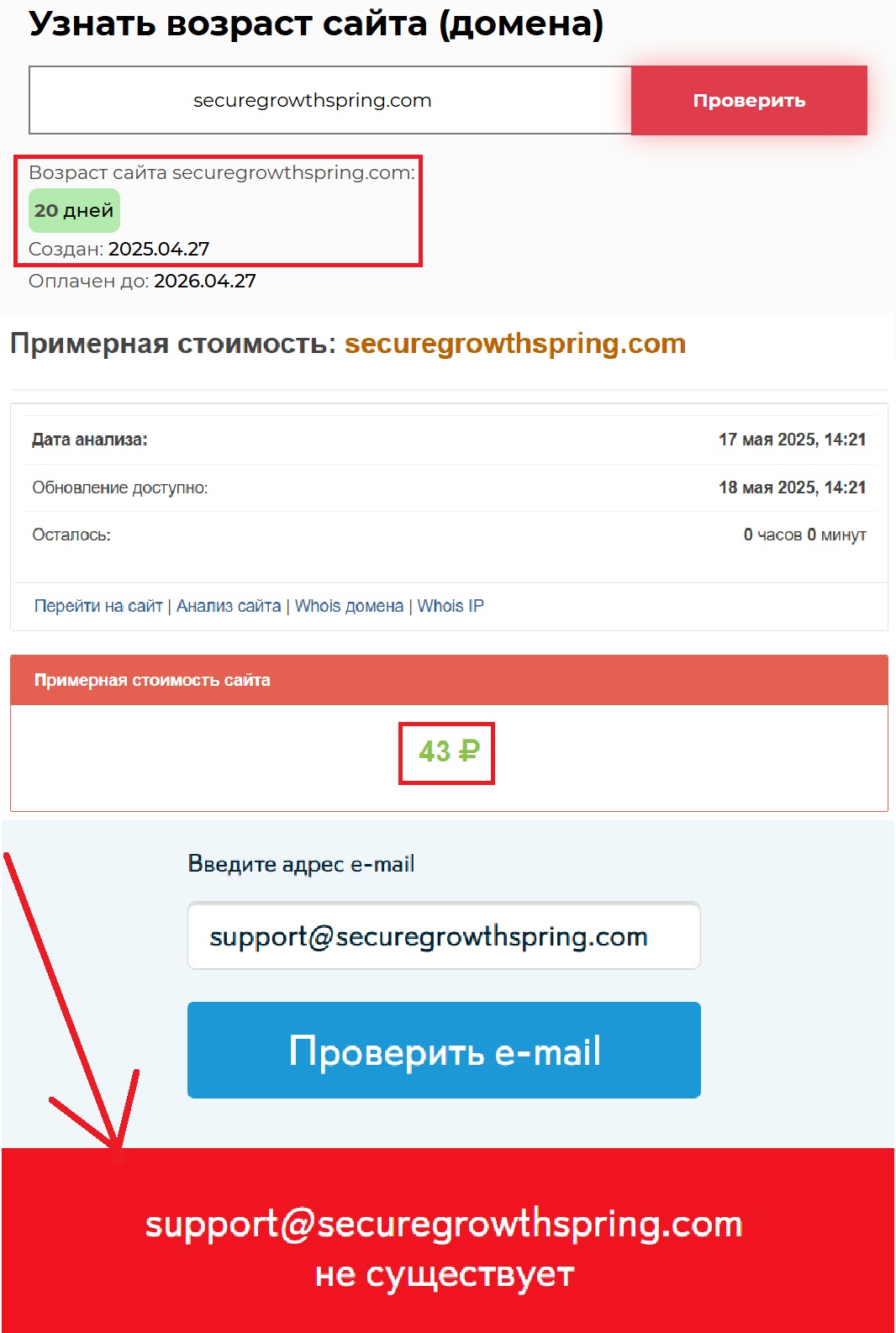 Кстати, домен стоит 43 рубля! То есть даже на нормальный старт мошенники не потратились. Еще один штрих: вместо реальных способов связи вам предлагают какую-то фейковую почту support@securegrowthspring.com и «адрес» в Великобритании. Вы, конечно, понимаете, что ни по этой почте, ни по этому адресу никого не найти. Это просто фейк, чтобы вы подумали — все по-настоящему. Отзывы о Lurvion? Негативные, все до единого. Люди пишут, что не могут ни вывести деньги, ни получить ответ. Ничего. И да, мы уверены: если вы отправите туда свои средства, результат будет тот же. Потому что цель этого проекта — вовсе не помочь вам заработать.
