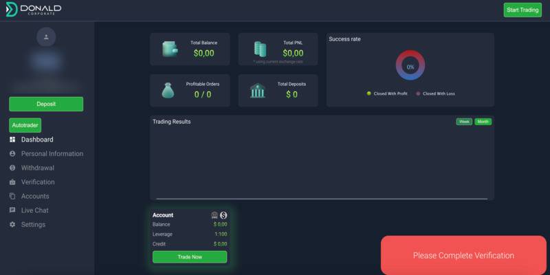 Отзывы пользователей все негативные, поскольку ни один клиент еще не смог вывести свои заслуженные деньги. Да, есть форма обратной связи, но она просто не работает. В то время как все легальные финансовые посредники выставляют лицензию и регистрацию, Donald Corporate решил скрыть документацию. В условиях полной анонимности рассчитывать на заработок глупо.