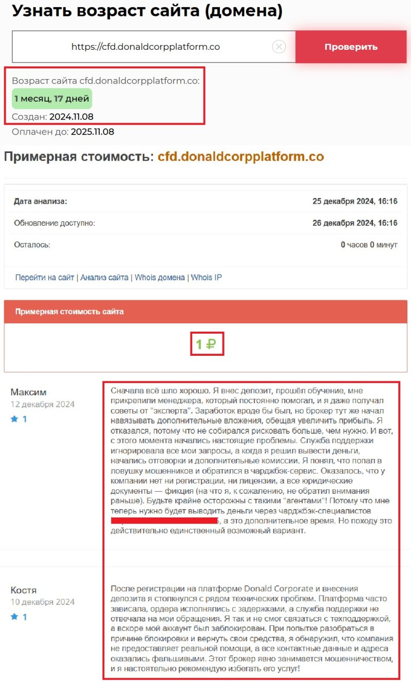 Чтобы найти потенциальных жертв, используются социальные сети и мессенджеры, то есть аферисты спамят фейковыми положительными отзывами и оставляют реферальную ссылку для того чтобы клиент мог свободно перейти по ней и начать инвестирование. К сожалению, как только инвестор внесет свои деньги в Donald Corporate, он может полностью распрощаться со всей суммой. Рассмотрим теперь информацию, которую нам удалось узнать при помощи сторонних сервисов.