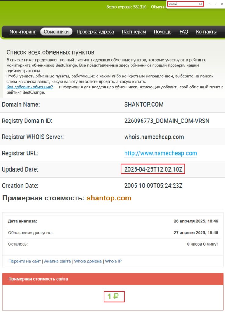 Дальше переходим к анализу самого домена. Вот один забавный факт о нем: ресурс зарегистрирован 9 октября 2005 года. Возраст вроде как внушительный, не так ли? Только на деле он таковым не является. Shantop работает только с 25 апреля 2025 года. Жулики нередко покупают старые площадки, чтобы создавать иллюзию многолетнего опыта. Но, к счастью, современные возможности позволяют раскрыть их затею с помощью всего парочки кликов.