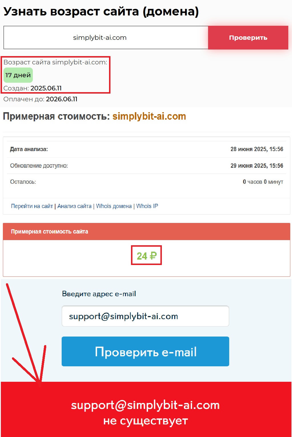 Теперь к датам. По версии самой площадки, она существует с 2010 года. Звучит солидно. Пятнадцать лет работы на рынке! Только вот, проверив историю домена, мы обнаружили, что контора начала функционировать только с 11 июня 2025 года. То есть все эти «годы опыта» — просто красивая обертка. По факту — пустышка. Да, и это важно: цена домена составляет всего 24 рубля. Серьезная ли это компания? Делайте выводы сами. Обещанная круглосуточная поддержка заключается в одной почте support@simplybit-ai.com, да и та фальшивая.