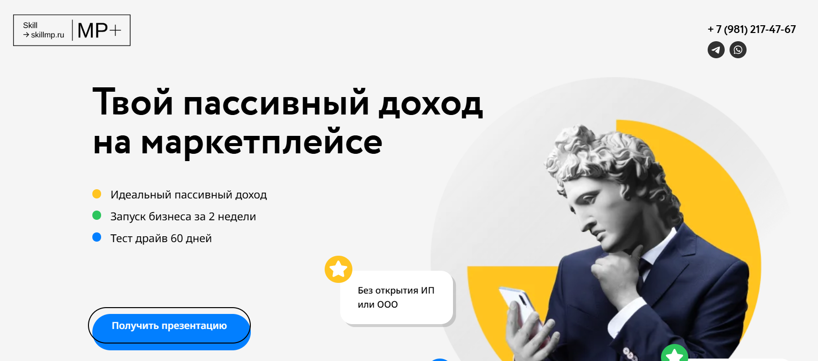 Проект Skillmp рассказывает о запуске бизнеса на Wildberries без регистрации ИП или ООО. Автора площадки также гарантируют клиентам прибыль от 50 000 до 850 000 рублей в месяц. Помимо этого они предлагают удаленное управление и старт за две недели.