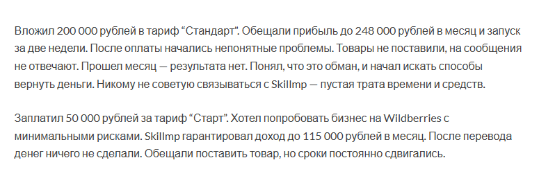 Из откликов в Интернете и социальных сетях можно узнать о том, что Skillmp не выполняет своих обещаний. Пользователи инвестируют деньги, а после этого начинают сталкиваться с различными трудностями (товары не поставляются, продукция не приходит). Нелегальная работа проекта лишь усиливает сомнения.