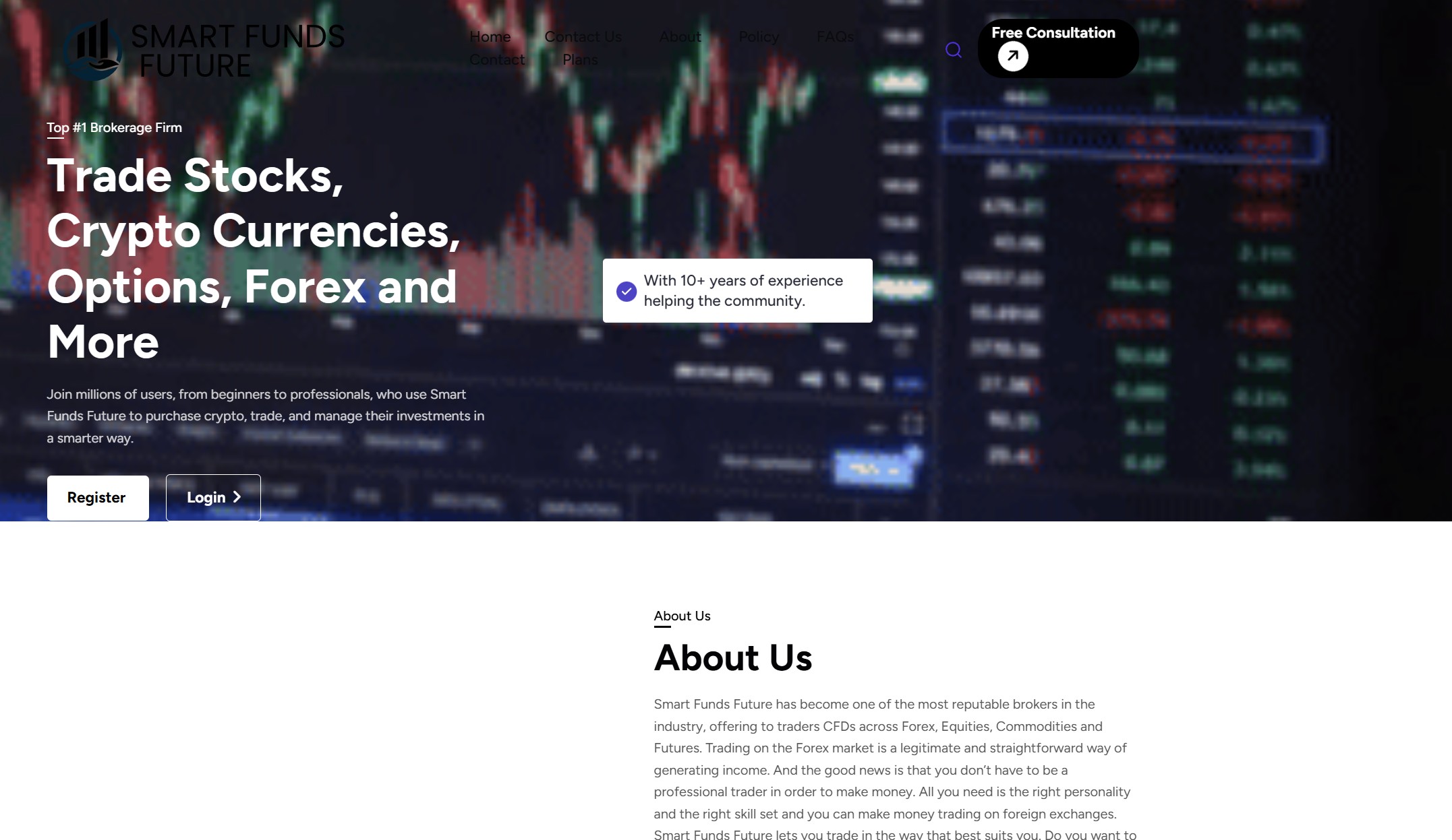 Мы задались целью — разобраться, кем является герой данного обзора. Первым делом зашли на сайт, адрес которого — smartfundsfuture.com. И вы знаете, это как открыть коробку конфет, а там внутри — пусто. Сайт дешевый, шаблонный. Нет ни изюминки, ни стиля, ни даже минимального желания сделать его удобным для пользователей. Такое впечатление, что его слепили за один вечер, просто чтобы было. И, к слову, похоже, так оно и есть: взяли чужой макет, изменили название, налепили поверх каких-то картинок из интернета и выкатили в сеть.