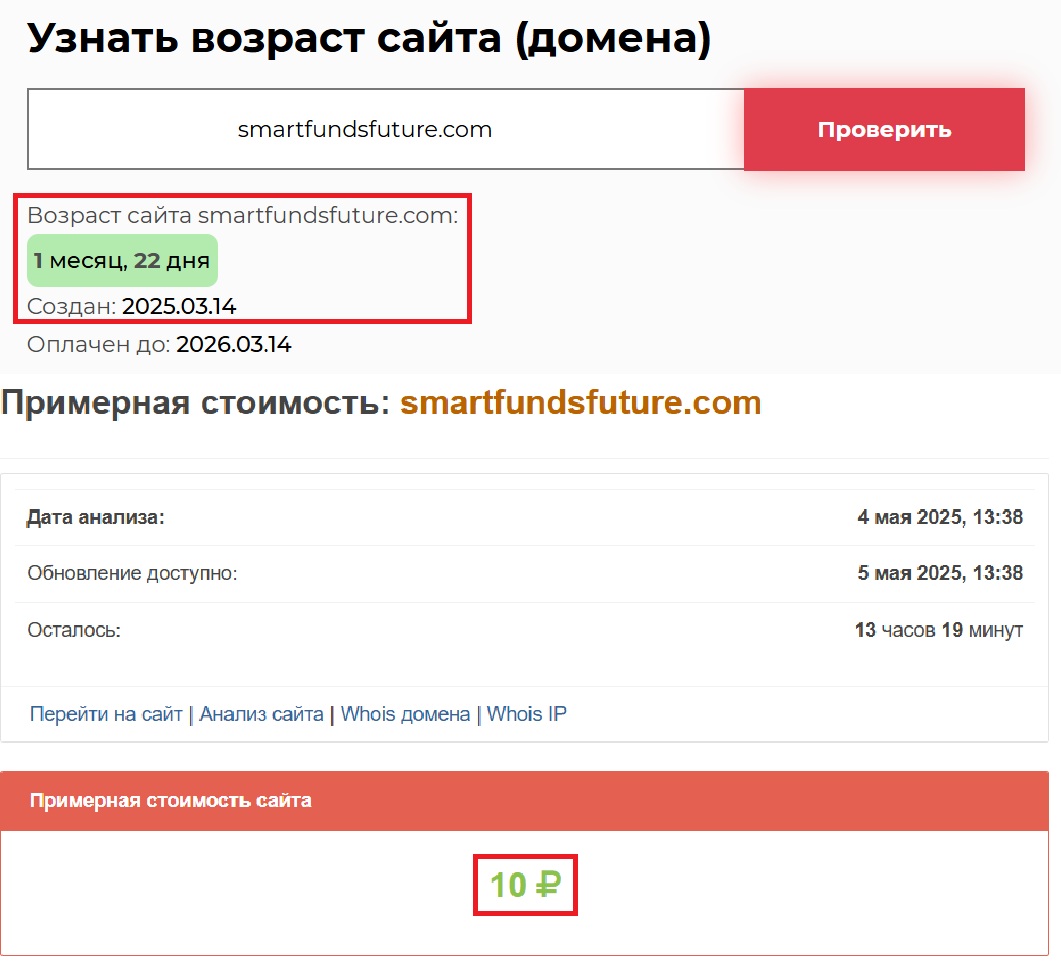 Ну и финальный штрих — срок жизни проекта. Не поверите, но вся эта «уважаемая» компания существует всего месяц и 22 дня. Причем домен стоит десять рублей. То есть даже сами владельцы проекта не собираются делать вид, что работают в долгую. Им это и не нужно. Отзывы? Один негатив. Люди пишут, что завели деньги, а вывести их уже не смогли. И мы в этом не сомневаемся. Потому что все указывает на одно — Smart Funds Future — это просто очередной развод. Классический, примитивный, но, к сожалению, все еще работающий.