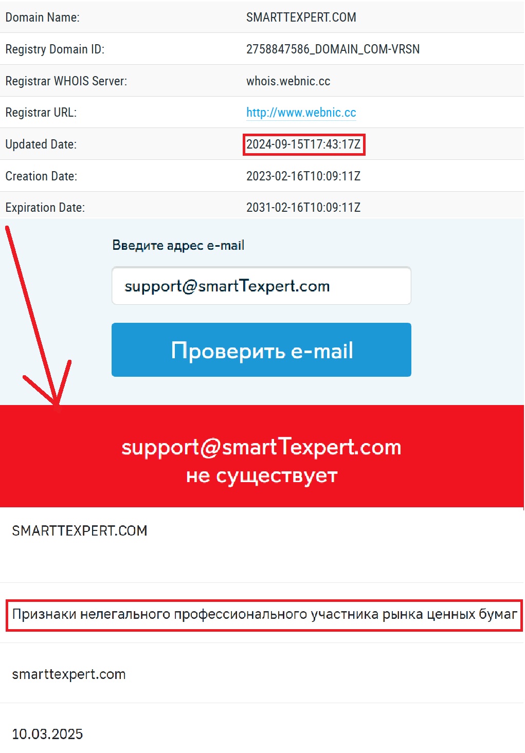 Теперь самое интересное. Проверка показала, что проекту всего чуть меньше шести месяцев — запущен он 15 сентября 2024 года. Для брокерской компании — это вообще не срок. Если вдруг у вас возникнут проблемы — дозвониться до них или получить ответ на письмо не получится. Контактная информация — липовая. Указанная почта support@smartTexpert.com просто не работает. Так что поддержки тут нет и не будет.