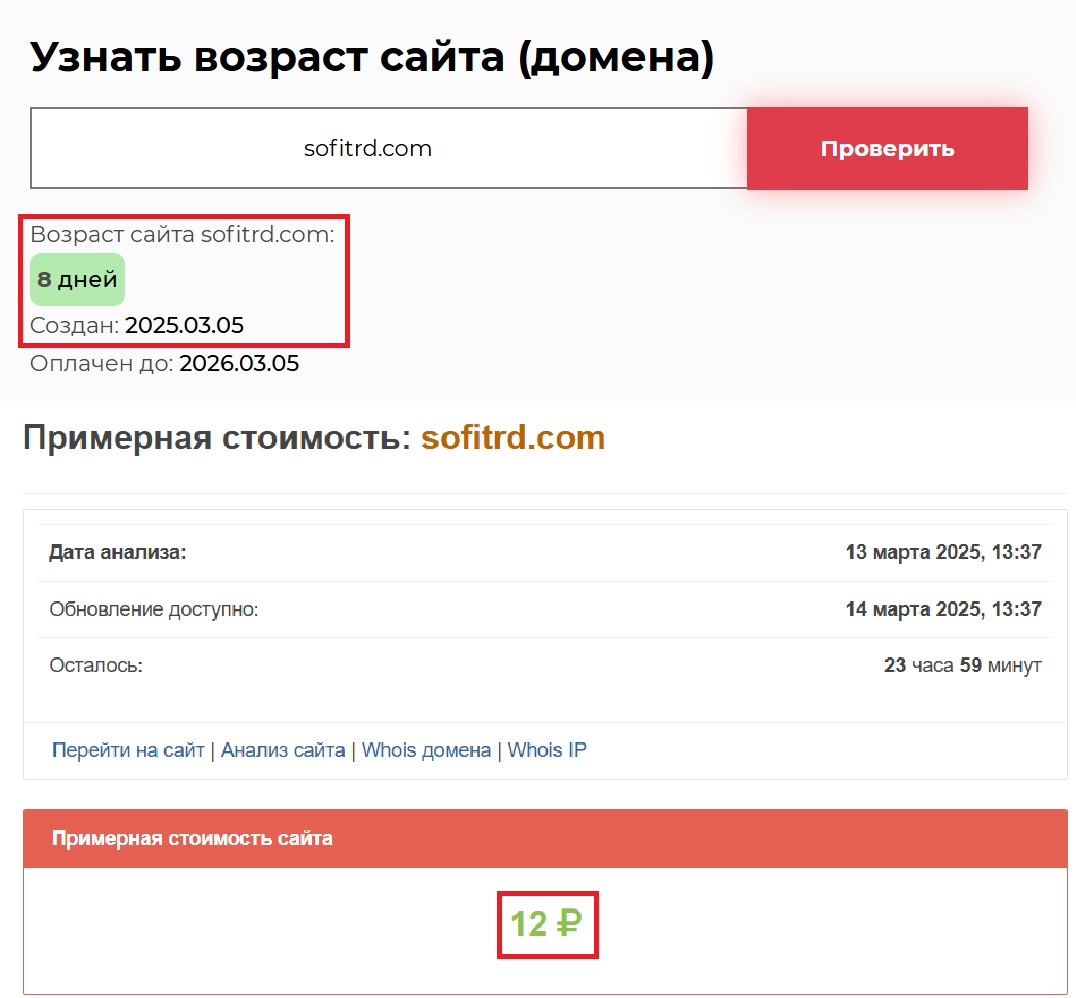 Теперь поговорим на языке фактов. SoFi Trade заявляет, что работает много лет, но проверка показывает, что сайт существует всего 8 дней. Разве можно назвать такую платформу надежной? Конечно, нет. Стоимость домена — 12 рублей. Вы серьезно думаете, что надежный финансовый посредник может стоить дешевле проезда в автобусе?