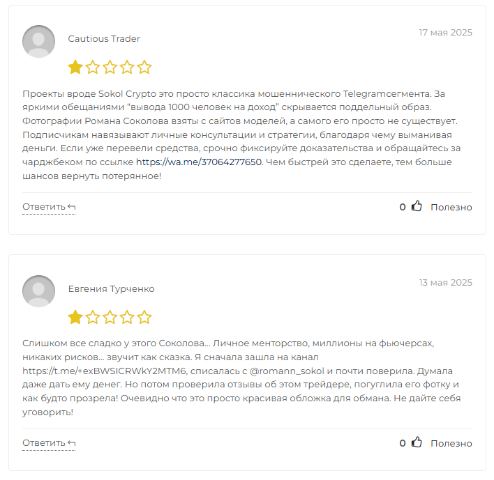 Из-за всего перечисленного и не удивительно, что паблик Sokol Crypto | От 0 до $2.5М обладает негативной репутацией в сети. Многочисленные отрицательные отзывы указывают на обман и потерю средств у пользователей при взаимодействии с владельцем лохотрона. Поэтому мы призываем обходить контору стороной и ни в коем случае не связываться с ее основателем.