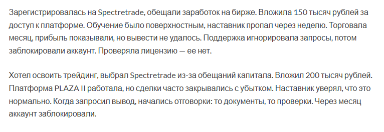 После тщательной проверки Spectretrade было выявлено, что их юридический адрес реален. Однако представленная лицензия от ЦБ РФ не подтверждена. В реестре Банка компания не числиться (а это обязательно для фирм, работающих с капиталами клиентов).