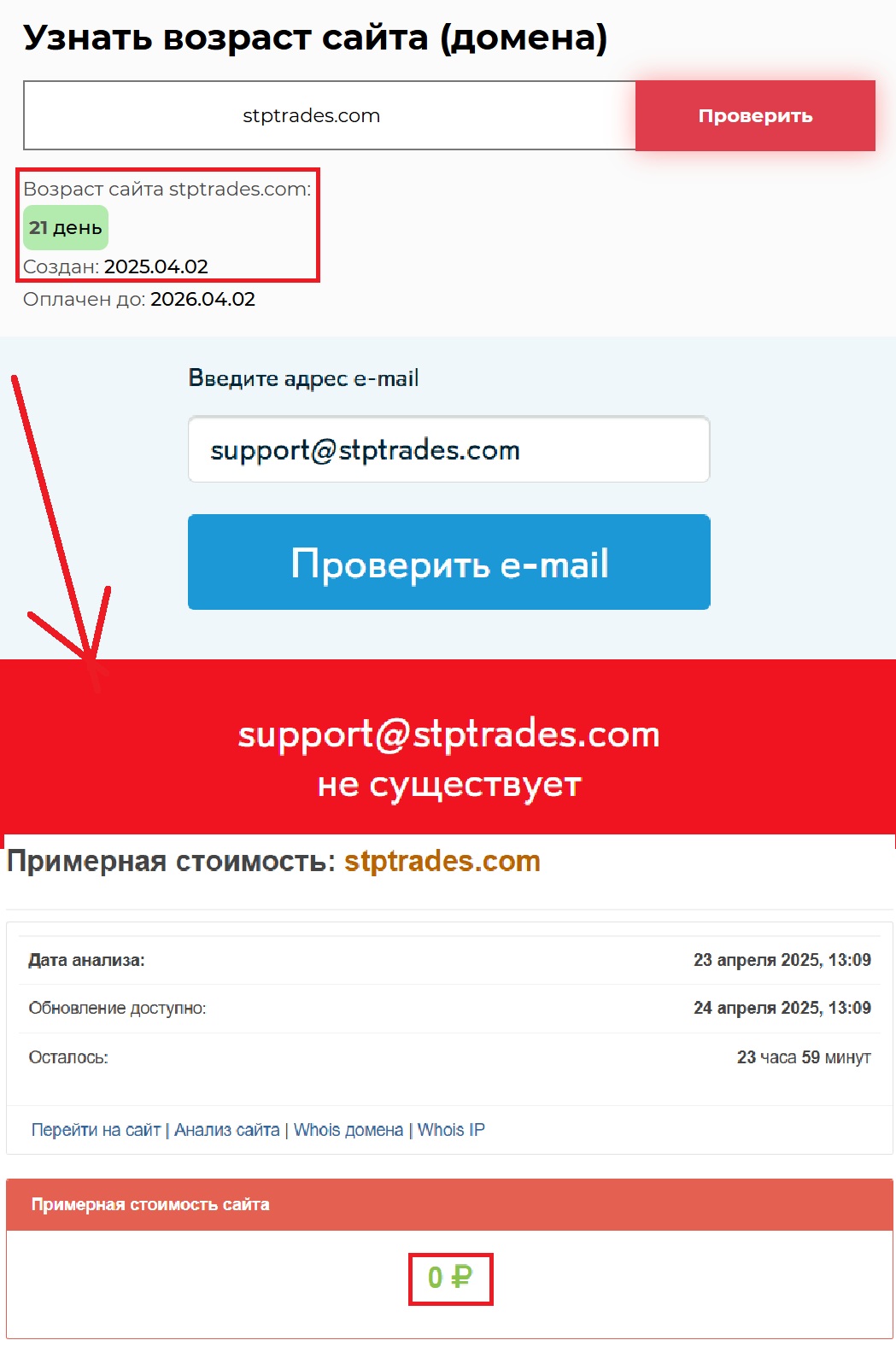 Ну и вишенка на этом торте — стоимость самого сайта. Ровно ноль рублей и это мы не шутим. Это не просто мало — это катастрофически мало для проекта, который позиционирует себя как международный финансовый игрок. Разве серьезные компании стартуют с таких цифр? Что же касается обратной связи — забудьте. Указанная почта support@stptrades.com — скорее всего, фейковая. И что самое страшное — ни одной лицензии и документа от какого-либо реального регулятора. По сути перед вами лохотрон, который в любой момент может закрыться и оставить вас ни с чем.
