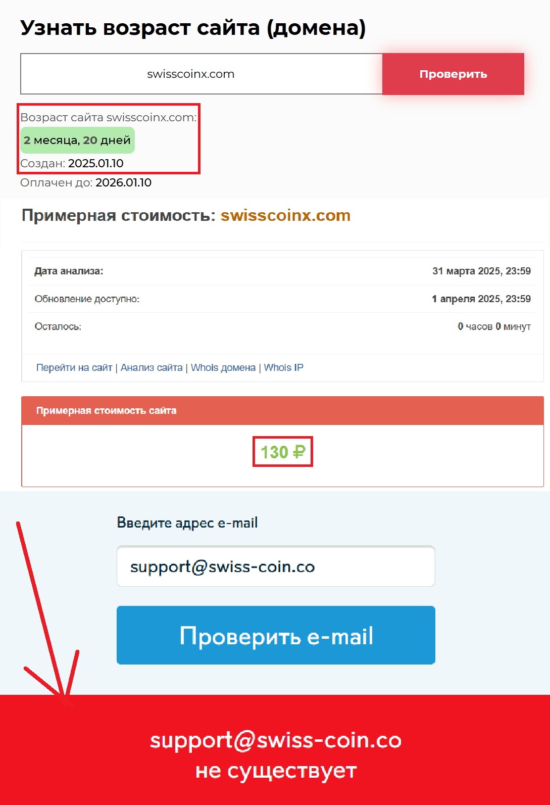 Чтобы окончательно убедиться в подозрительности этой платформы, мы провели проверку через сторонние сервисы. Результаты оказались предсказуемыми: сайт зарегистрирован 10 января 2025 года, то есть ему всего несколько месяцев, хотя компания уверяет, что работает много лет. О каком опыте можно говорить, если проект существует лишь три месяца? Но это еще не все. Домен стоит всего 130 рублей — очевидный признак того, что вложения в него минимальные, а значит, рассчитывать на серьезную компанию точно не стоит.