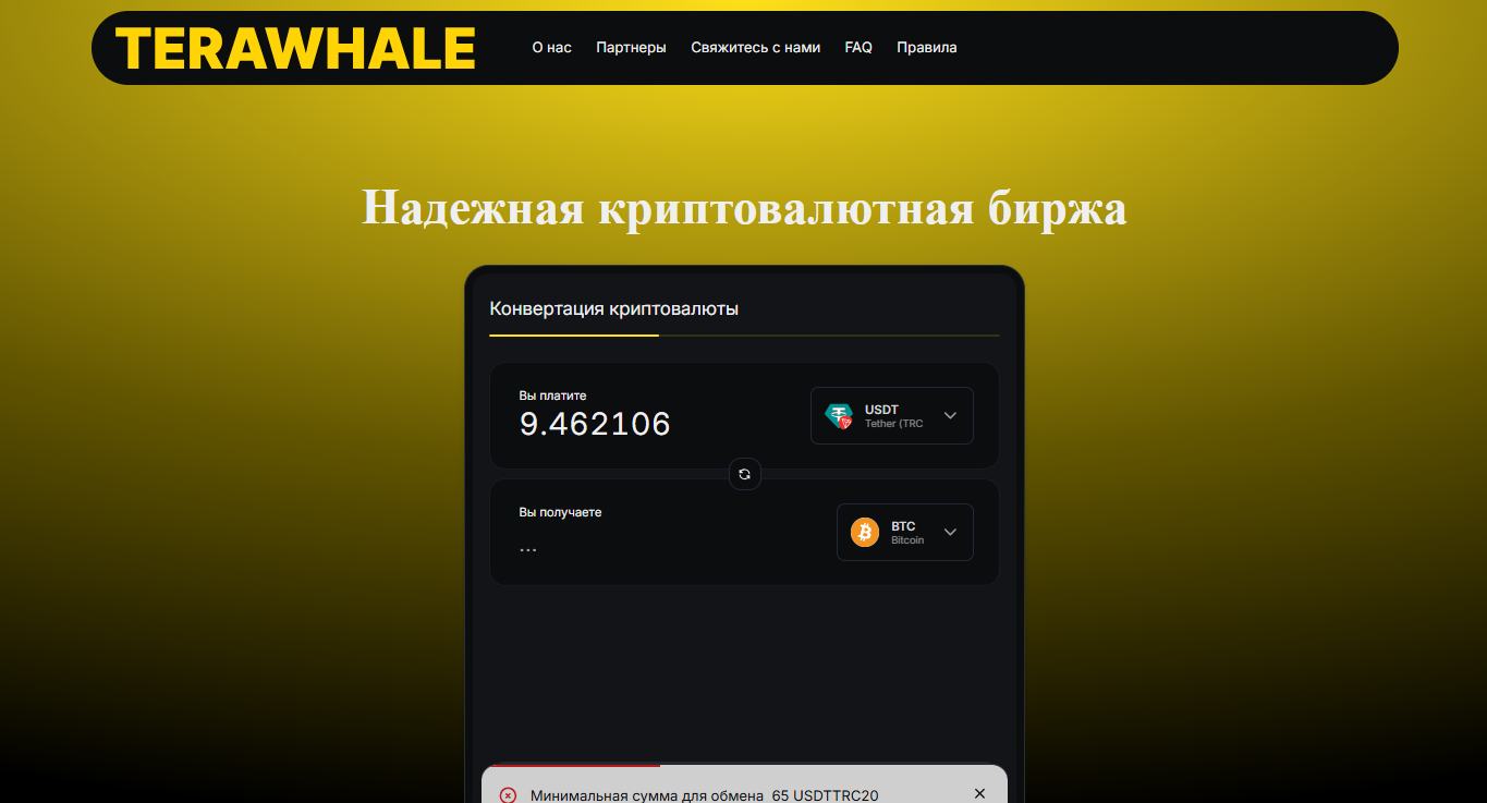 Мир обменников крипты продолжает стремительно расти, а вместе с этим увеличивается и число людей, желающих нажиться на доверчивых пользователях, не способных вовремя отличить реальный и надежный проект от обычной мошеннической ловушки. Такими личностями выступают создатели фальшивого обменного пункта Terawhale. Они представили свой сервис, как идеальную площадку для работы. Но на деле их лохотрон не стоит и капли внимания.