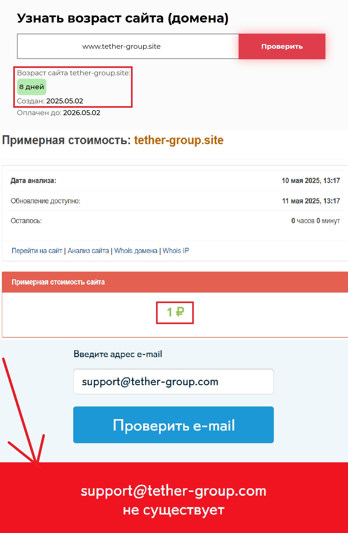 Казалось бы, платформа с опытом должна внушать доверие. Но вот загвоздка: все это — красивая ширма. На деле, домен зарегистрирован всего 8 дней назад, то есть 2 мая 2025 года. Стандартный трюк — сделать вид, что ты работаешь годами. Только вот тех, кто действительно работает долго, выдают совсем другие вещи — документы, регистрация, лицензия от регулятора. В случае с Tether-Group — ничего этого нет.