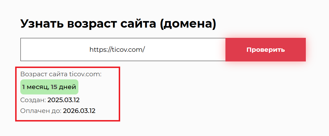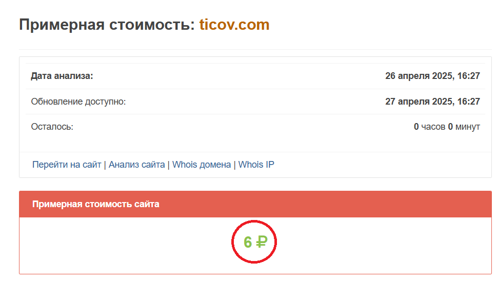 О недобросовестности Ticov свидетельствует несколько моментов. Прежде всего предлагаем обратить внимание на сайт кошелька. В ходе проверки домена удается узнать, что он был создан около 1 месяца назад, а его примерная стоимость составляет всего 6 рублей.