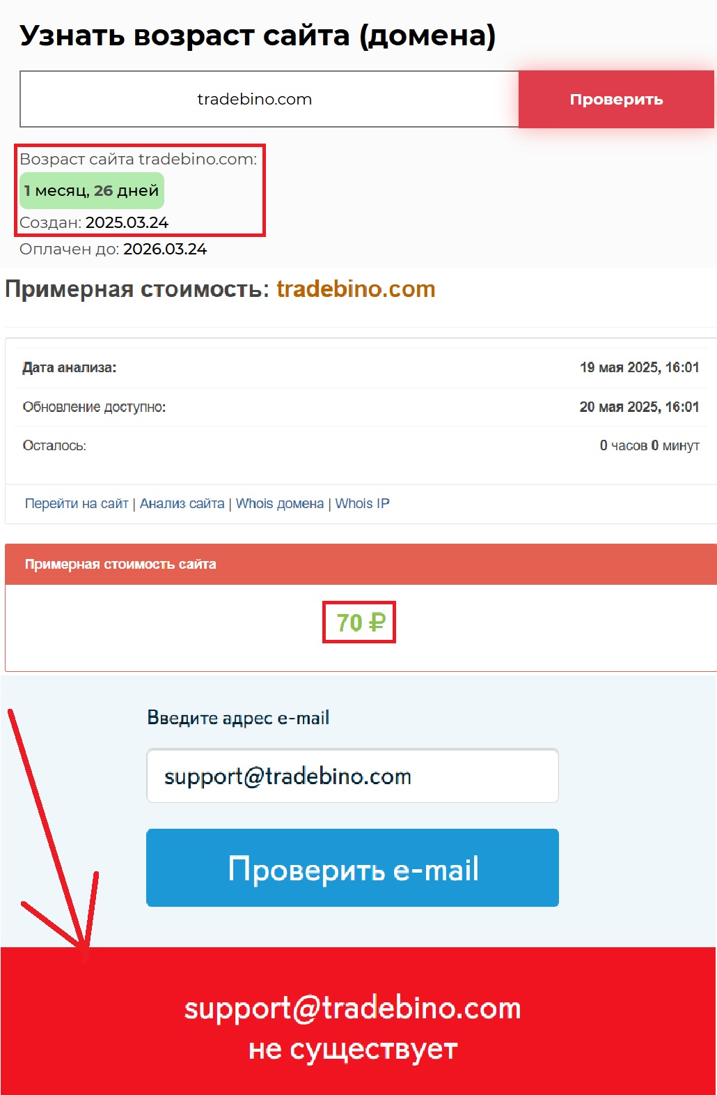 И вот еще важный момент: активность сайта началась совсем недавно. Домен был зарегистрирован 24 марта 2025 года, то есть афера работает всего лишь 1 месяц и 26 дней. Так где же обещанный многолетний опыт? Кстати, одним из признаков нелегальной деятельности является и отсутствие адекватных контактов. Электронная почта support@tradebino.com фейковая. Что и требовалось доказать.