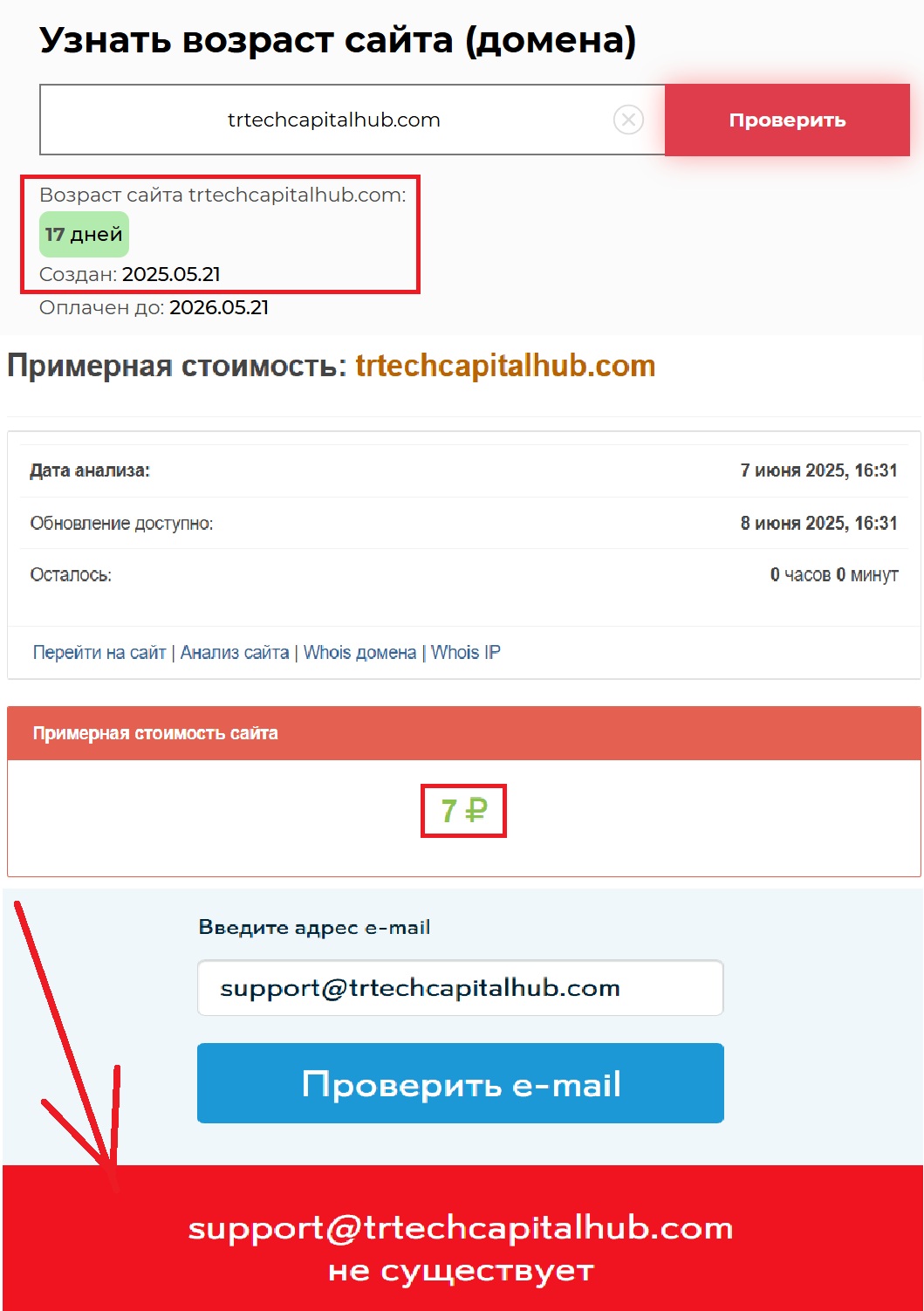 И все же давайте не будем делать выводы на эмоциях. Обратимся к фактам. Данные сервиса Whois подтверждают: сайт существует с 21 мая 2025 года. 17 дней — и все. Разве можно за столь короткий срок добиться статуса доверенного финансового посредника? Мы крайне сомневаемся. А вы? Кстати, стоимость регистрации домена — всего семь рублей. Вот представьте: вы отдаете свои кровные такой «компании», а они даже не потрудились вложиться в разработку нормального сайта.