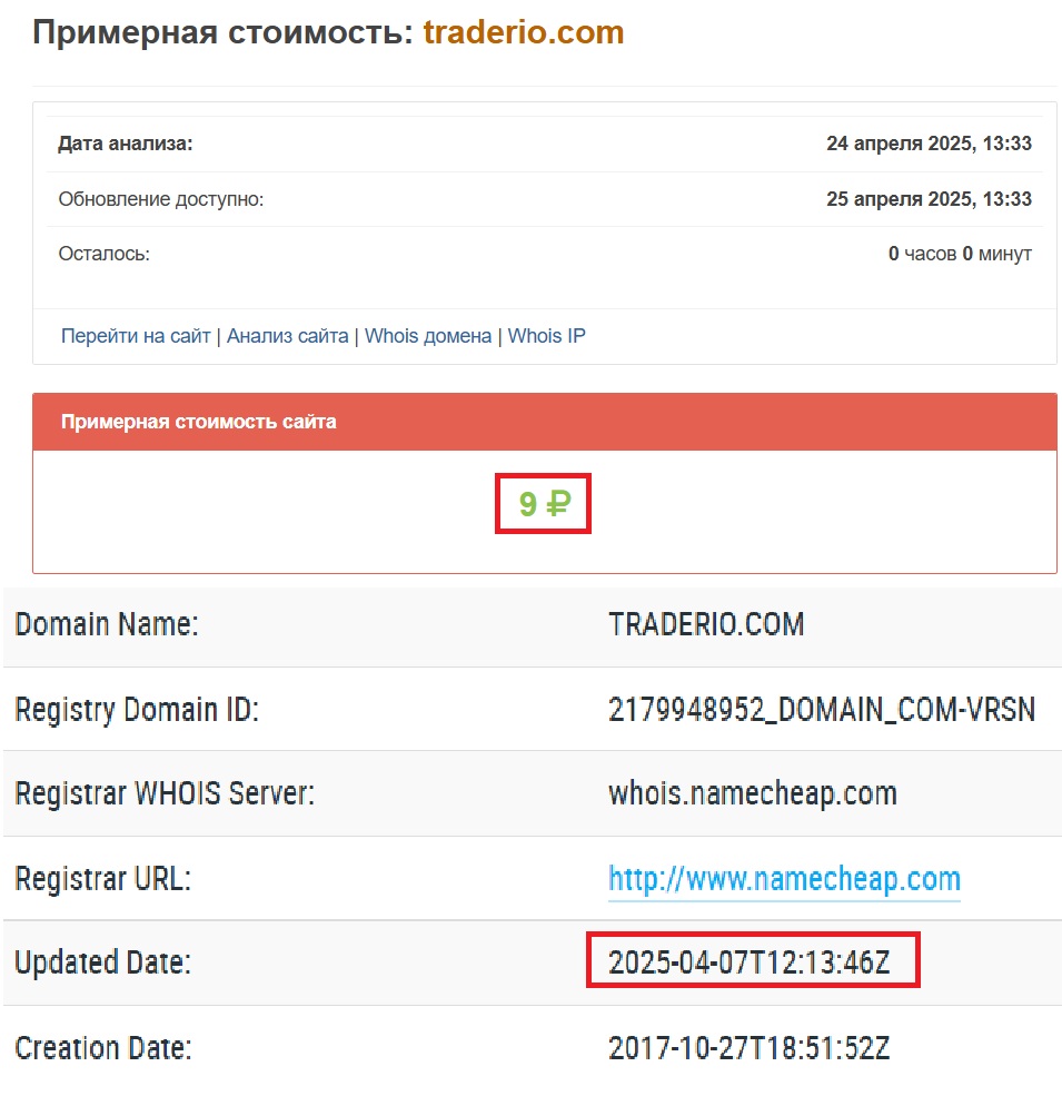 Мы изучили этот проект от и до. Да, на первый взгляд кажется, что все прилично. Есть сайт traderio.com, есть легенда про финансовый рост, есть даже какие-то якобы сделки. Но как только начинаешь копаться в деталях — все сыплется. Например, стоимость самого сайта. Серьезно? Девять рублей? Это даже не смешно.