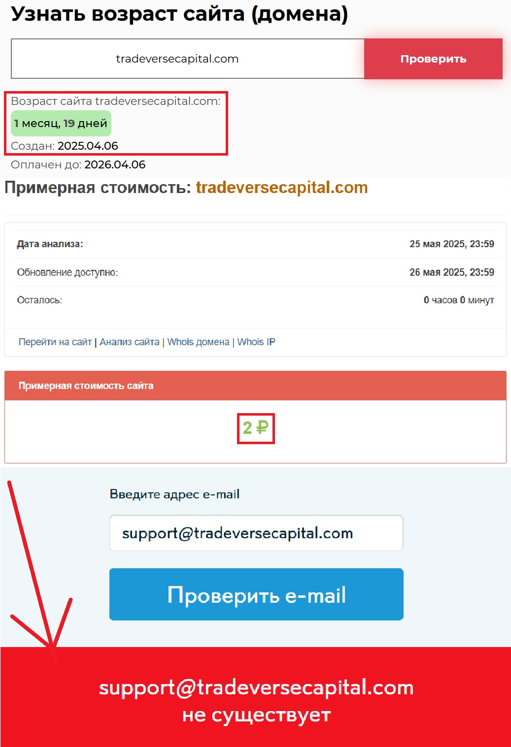 Интересно, что проект был зарегистрирован, если верить открытым данным, только 1 месяц и 19 дней назад, так, а где тогда многолетний опыт? Да и отзывы, которые появились в последнее время, исключительно негативные. Это должно о чем-то говорить. Нельзя пройти мимо того факта, что стоимость вышеуказанного домена всего два рубля, что крайне мало для нормального финансового посредника. Что еще примечательно — из контактной информации есть только фейковая почта support@tradeversecapital.com.