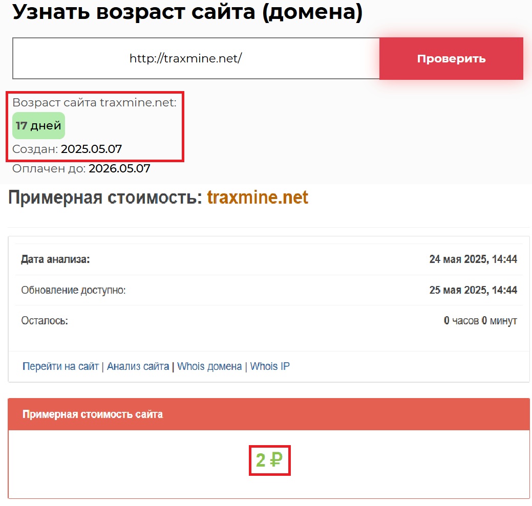 Теперь о самом интересном — сроках работы. На сайте сказано, что компания существует с 2012 года. Более 13 лет! Казалось бы, солидный стаж. Но когда мы провели независимую проверку, выяснилось: домен был зарегистрирован только 7 мая 2025 года. Вы понимаете, насколько это абсурдно? Говорят одно, а по факту — другое. Хотели впечатлить, но только больше запутали.