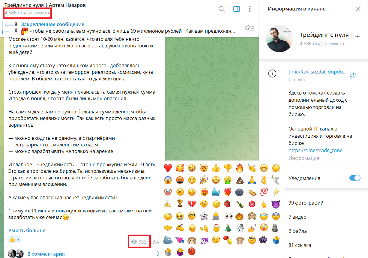 Предлагаем обратить внимание и на статистику канала: сейчас на него подписано около 4500 юзеров, но свежими постами при этом интересуется не больше 1000. Комментарии и реакции (доступные в полном объеме) оставляют единицы. Этот момент может указывать на использование админом-мошенникам услуги по накрутке аудитории. К ней часто прибегают многие аферисты, чтобы создавать иллюзию популярности своих творений.